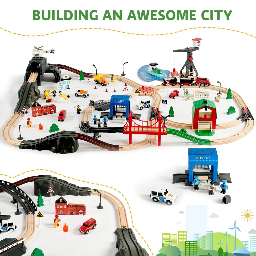 Discover the Joylike 153-Piece Wooden Train Set for Children: The Joylike wooden train set is meticulously designed to inspire creativity and imaginative play in children. Featuring an impressive collection of 153 pieces, including premium wooden tracks, themed building blocks, and various accessories, this set offers an expansive play experience. With six unique themes—Hospital, Fire Station, Police Station, Farm, Construction Site, and Dock—children can engage in endless creative building and role-playing adventures, making it an ideal choice for family bonding or group playtime.