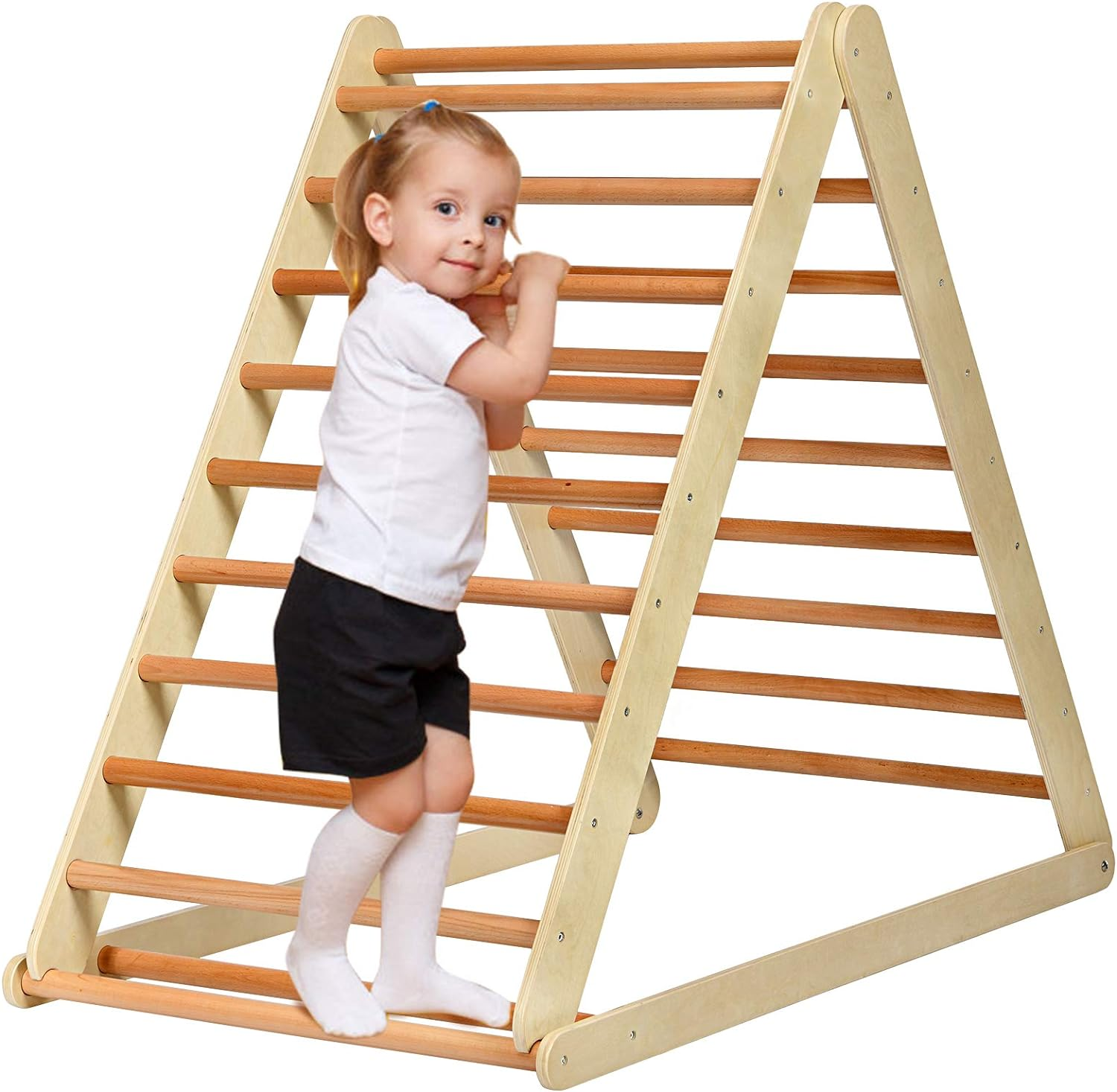 Constructed from natural poplar and birch wood, the HONEY JOY Triangle Climber is built to withstand the rigors of active play while ensuring safety for your little ones. The sturdy triangular structure, reinforced with an H-shaped base, supports up to 132 lbs, making it suitable for children aged 6 months to 6 years. Designed with rounded corners and smooth polished edges, this climber prioritizes safety, allowing children to explore freely without the worry of injury. The folding design allows for easy storage when not in use, making it a practical addition to any home. Whether as a gift for birthdays or special occasions, this climbing set is sure to delight both boys and girls.