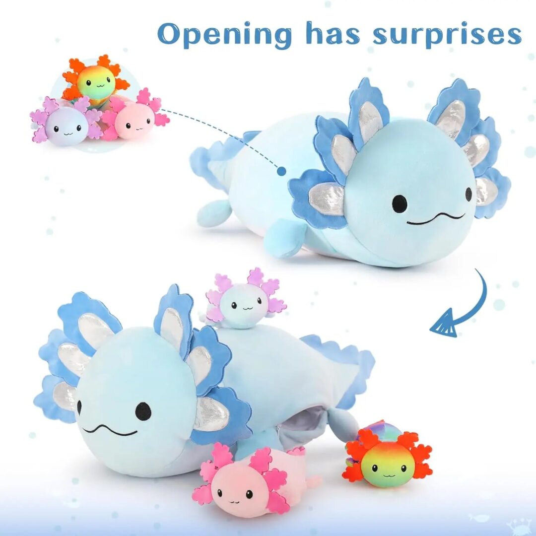 This unique plush set features a giant axolotl with three adorable baby axolotls nestled inside, creating an element of surprise and joy. Simply unzip the belly of the larger plush to reveal the charming little babies, making it an irresistible gift for any axolotl enthusiast. Whether it’s for a birthday, holiday, or just because, this plush collection is sure to spread happiness and warmth, making it a thoughtful present for kids and teens alike.