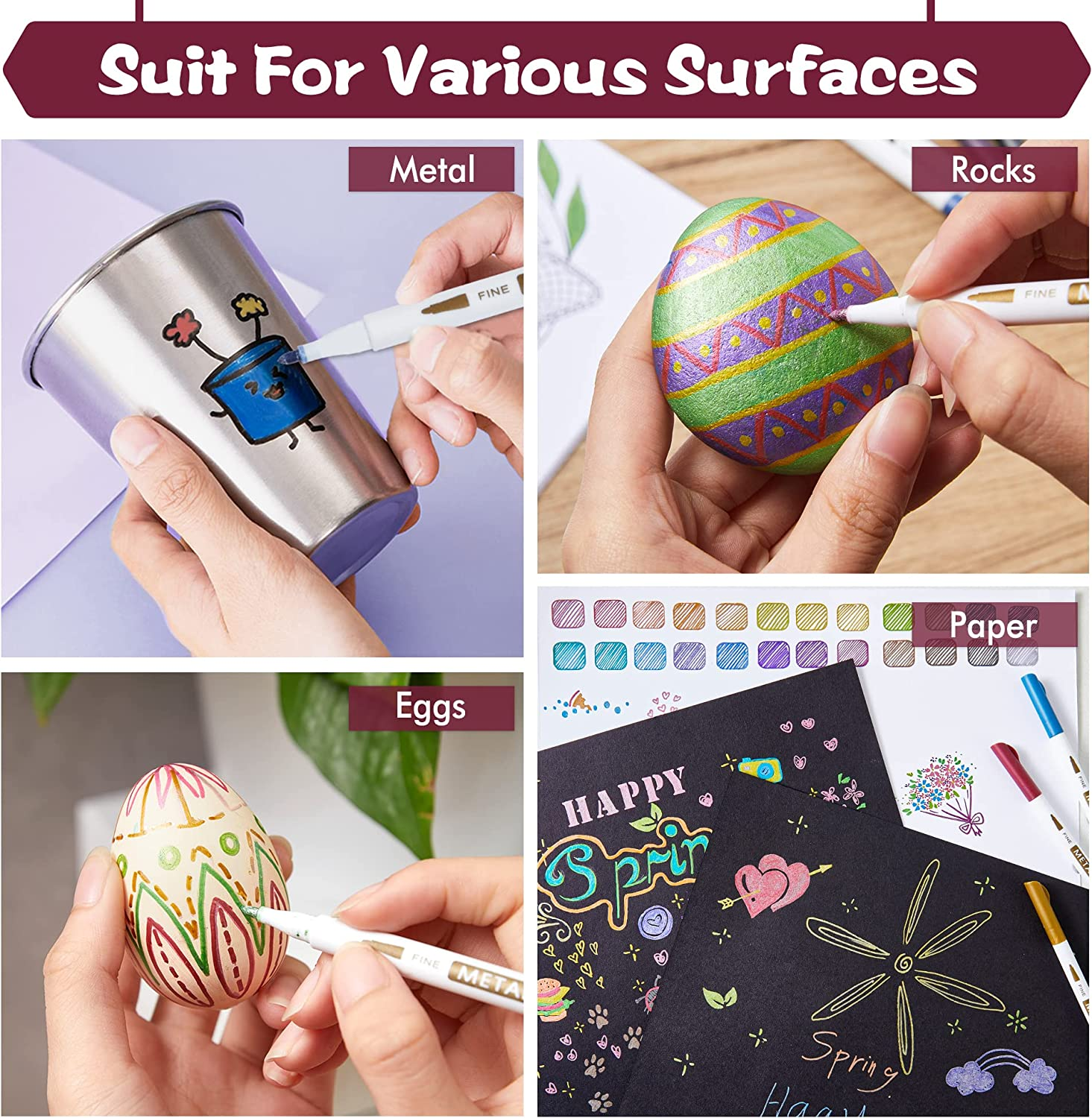 - 【Works on Most Surfaces】: These versatile metallic paint markers perform exceptionally well on a variety of surfaces, including black paper, stones, cards, glass, ceramics, metal, wood, and more. They are perfect for decorating cards, creating scrapbooks, and completing various school crafting projects, allowing you to express your creativity across multiple mediums.