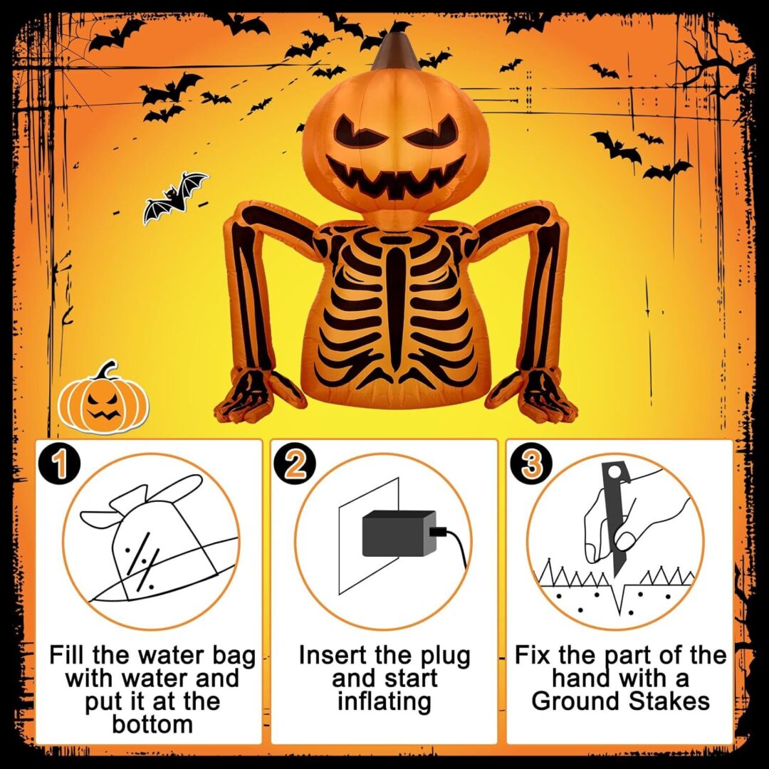 - Effortless Setup with Powerful Fan: Designed with convenience in mind, the skeleton pumpkin inflatable features a powerful fan that allows for quick and easy setup or takedown in minutes. This makes it an excellent choice for busy homeowners looking to transform their lawn or garden into a spooky spectacle with minimal effort.