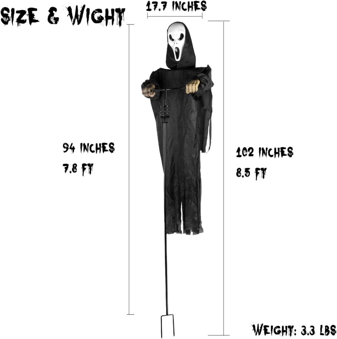 • High-Quality Halloween Animatronics: This ghost decoration is not just visually striking but also includes animated motion, adding a spine-tingling effect to your Halloween display. Its realistic appearance, complete with a spectral mask and flowing black cloak, makes it seem as if a genuine ghost is haunting your yard.