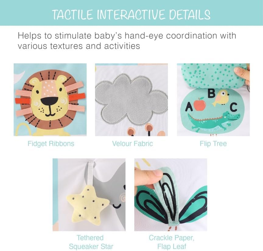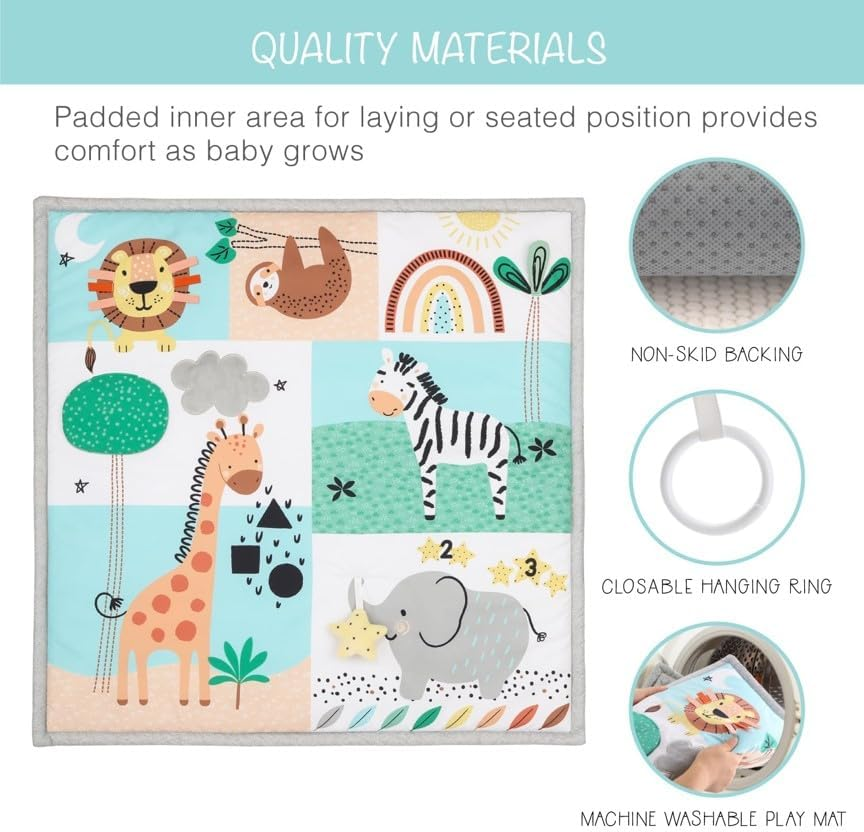 • Versatile 7-in-1 Baby Activity Center – Engages baby with sounds, shapes, and textures featuring a fun and colorful scene of safari animals, shapes, letters, colors, numbers and trees.