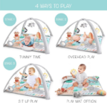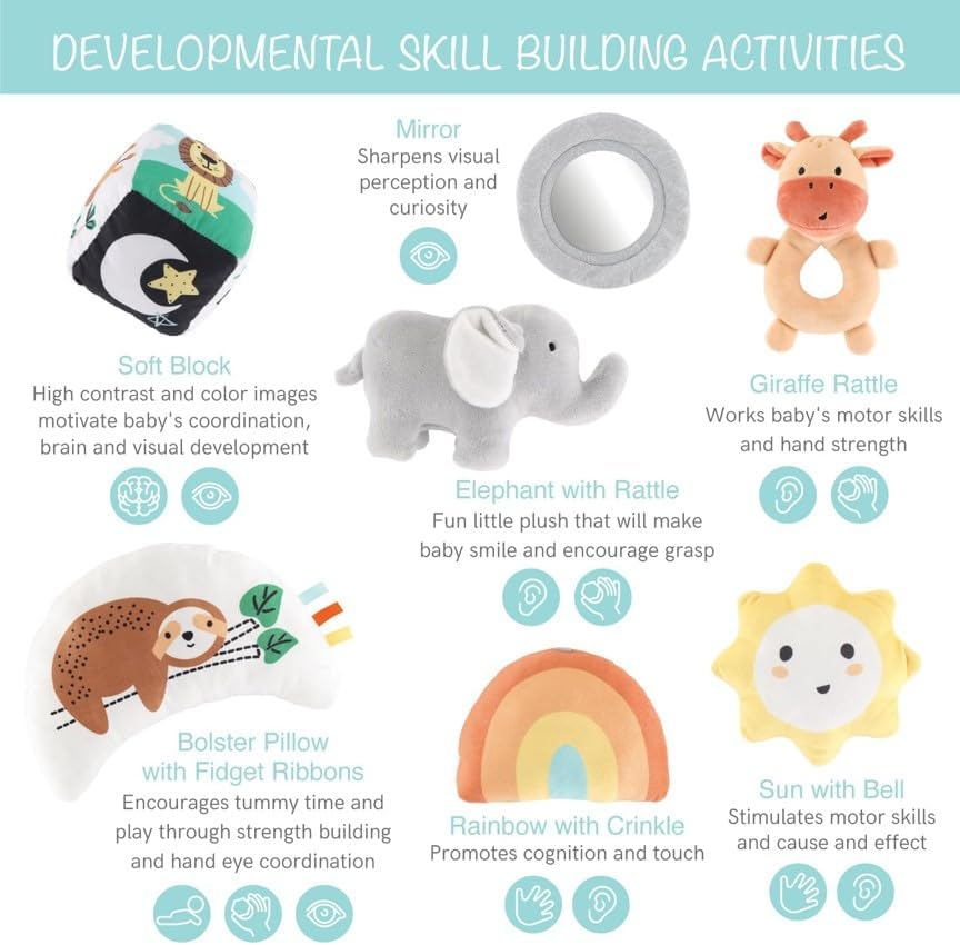 • Developmental Stages Support – Our baby play mat promotes motor skills, sensory and cognitive development through a mirror, toys, rattle, crinkle, bell, fidget ribbons, and tummy time pillow. Suitable for various baby stages from tummy time to sitting up.