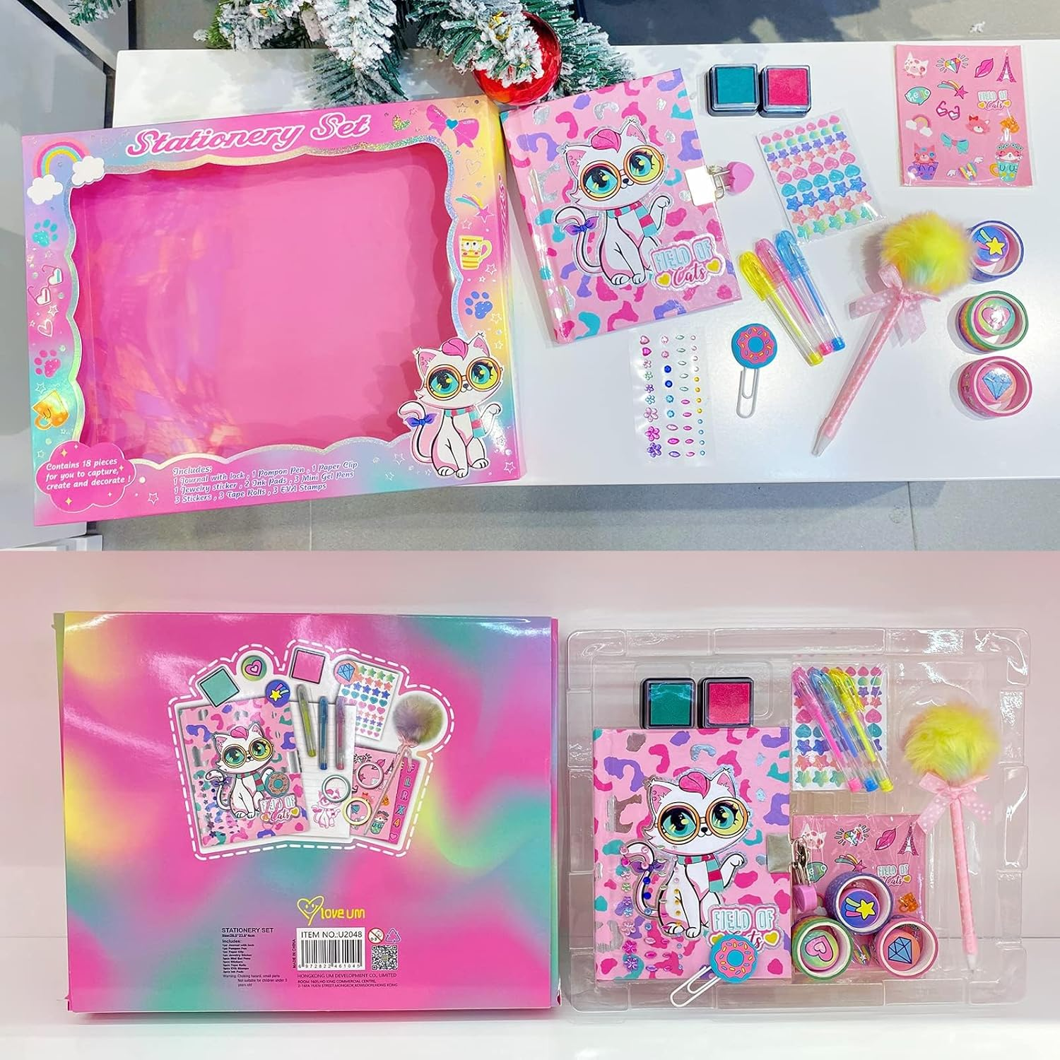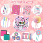 - Charming Cat Diary Set for Girls: This delightful package includes a beautifully designed Cat Journal with a secure lock, a fluffy Pompon Pen, a decorative Paper Clip, a Jewelry Sticker, two vibrant Ink Pads, three Mini Gel Pens, three adorable Stickers, three Tape Rolls, and three EVA Stamps, making it an exceptional gift for young cat enthusiasts.