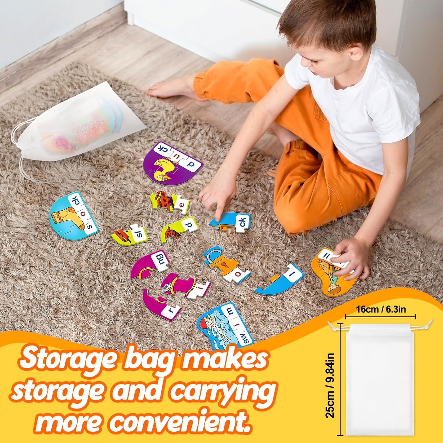 The Alphabet Word Puzzle Cards for Kids are not only educational but also easy to carry. The set includes a storage bag that holds all the puzzle pieces, making it convenient to store and carry. This means that children can play with these puzzle cards on trains, planes, and road trips, allowing them to continue learning CVCC & CCVC words while having fun.