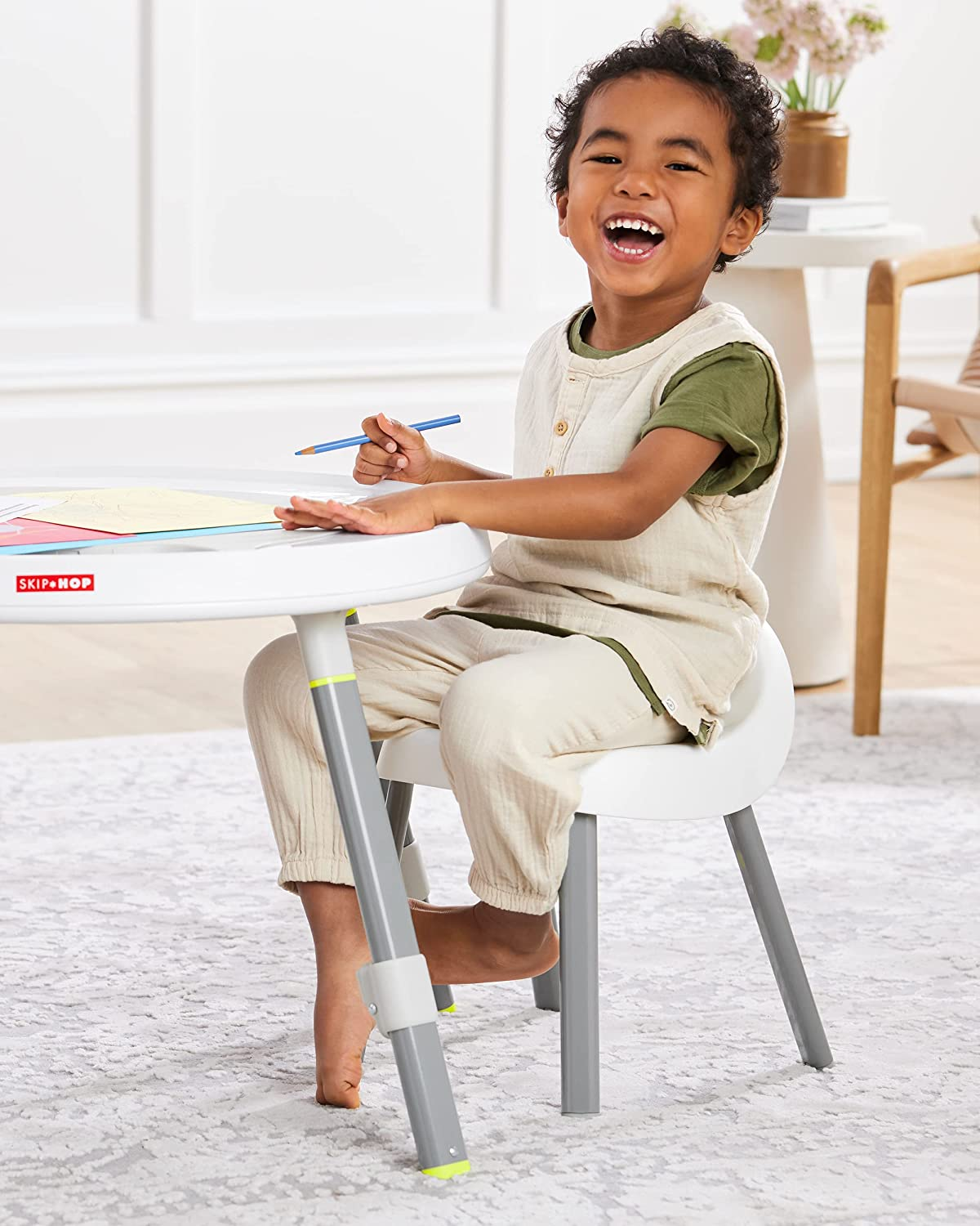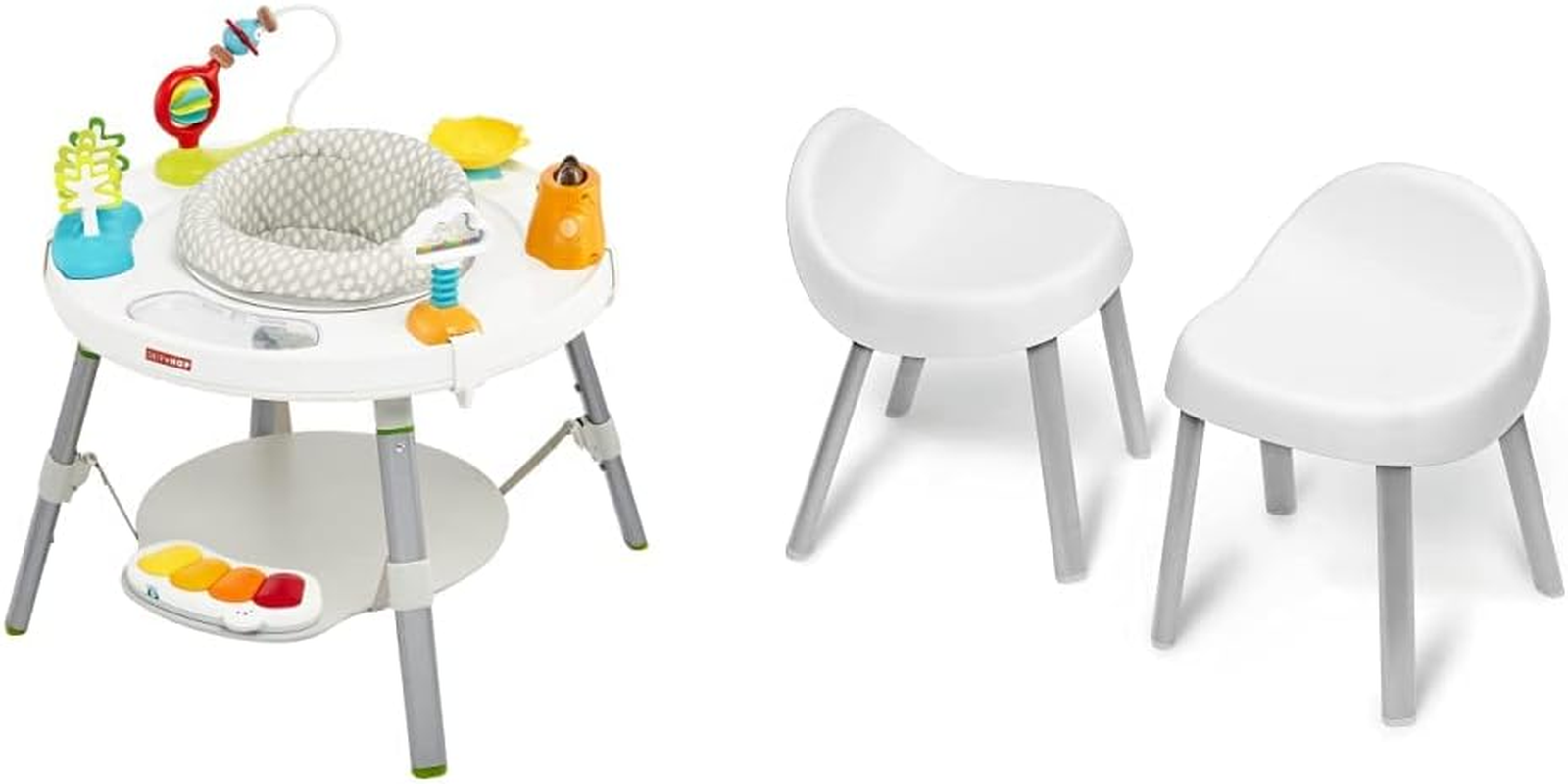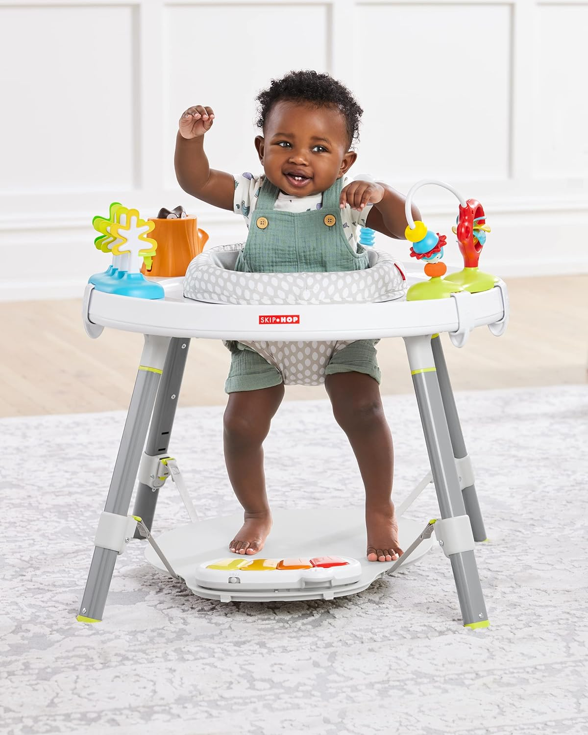 Designed in collaboration with a pediatrician, our baby activity center supports a “whole body” approach to play and learning. Easy to assemble, with toys that can be positioned anywhere for baby, it features a 360-degree rotating seat that turns and stretches for bouncing. Our unique Discovery Window™ lets baby see their feet while they play to learn cause and effect. As baby grows, our activity center converts for easy cruising—ultimately becoming a clean, sturdy table for coloring, playing and more. A modern, clean aesthetic and multiple uses will make this activity center a family favorite!.