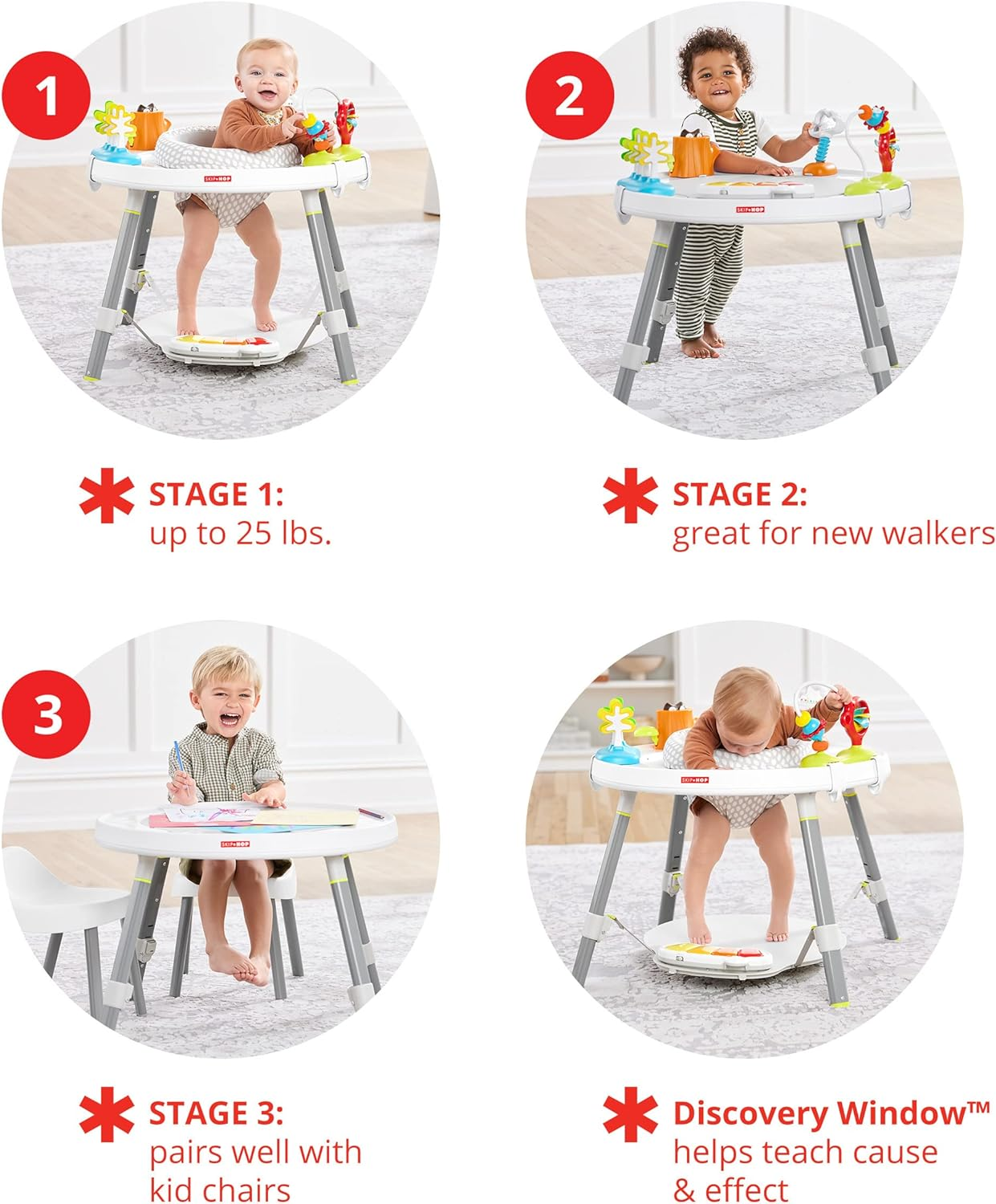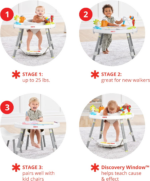 • Three stages of use: Sit, swivel, bounce & play; Cruise & interact; Play table; 25+ developmental activities