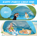• UVA/UVB Protection and Kid-Safe Materials: Our baby tent for beach built-in 4-layer UV protection coating protects your child from harmful sun rays.Keep children ages 6 months to 5 years out of the sun under a pop up beach tent. Crafted from non-toxic, child-friendly 210T materials, prioritizing the safety and well-being of your little ones