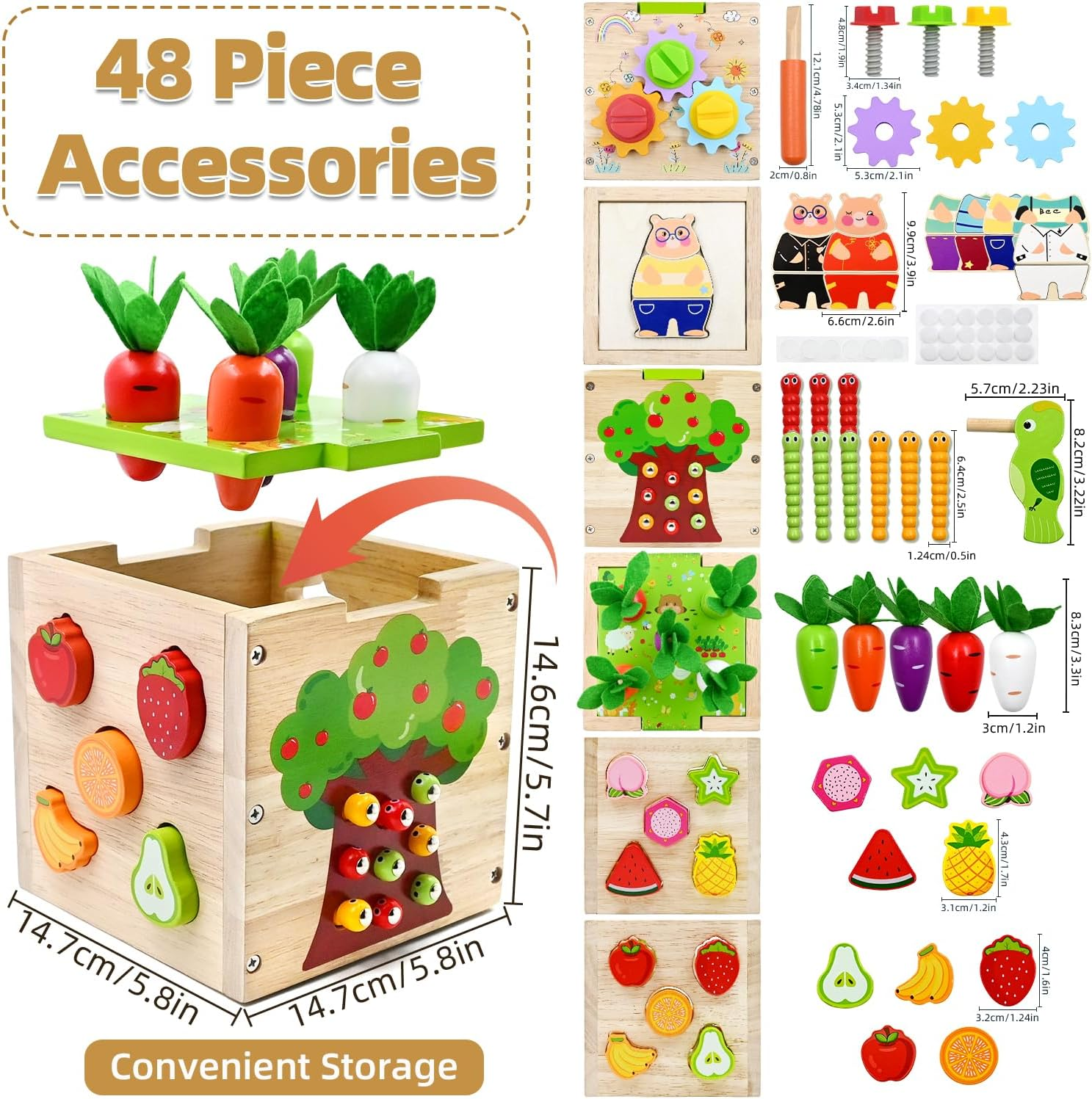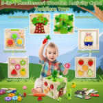 – Includes Multiple Educational Activities: Each cube toy features various activities such as carrot harvesting, animal dress-up puzzle, woodpecker bug-catching, rotating gear nut, and fruit shape sorting, providing endless learning opportunities for your child.