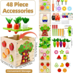• 【Great Sensory Travel Toy】Due to the appropriate size and weight of the blocks, can be stored in the wooden box, making it easy to store and carry! The vibrant colors, different shapes, and textures of fruits, carrots, and other blocks provide sensory stimulation, keeping 2 3 4 year old kids entertained during short trips! Designed for easy grip in small hands, children will love activities like pulling out carrots and matching fruits! and enhance color, shape, and fruit recognition skills.