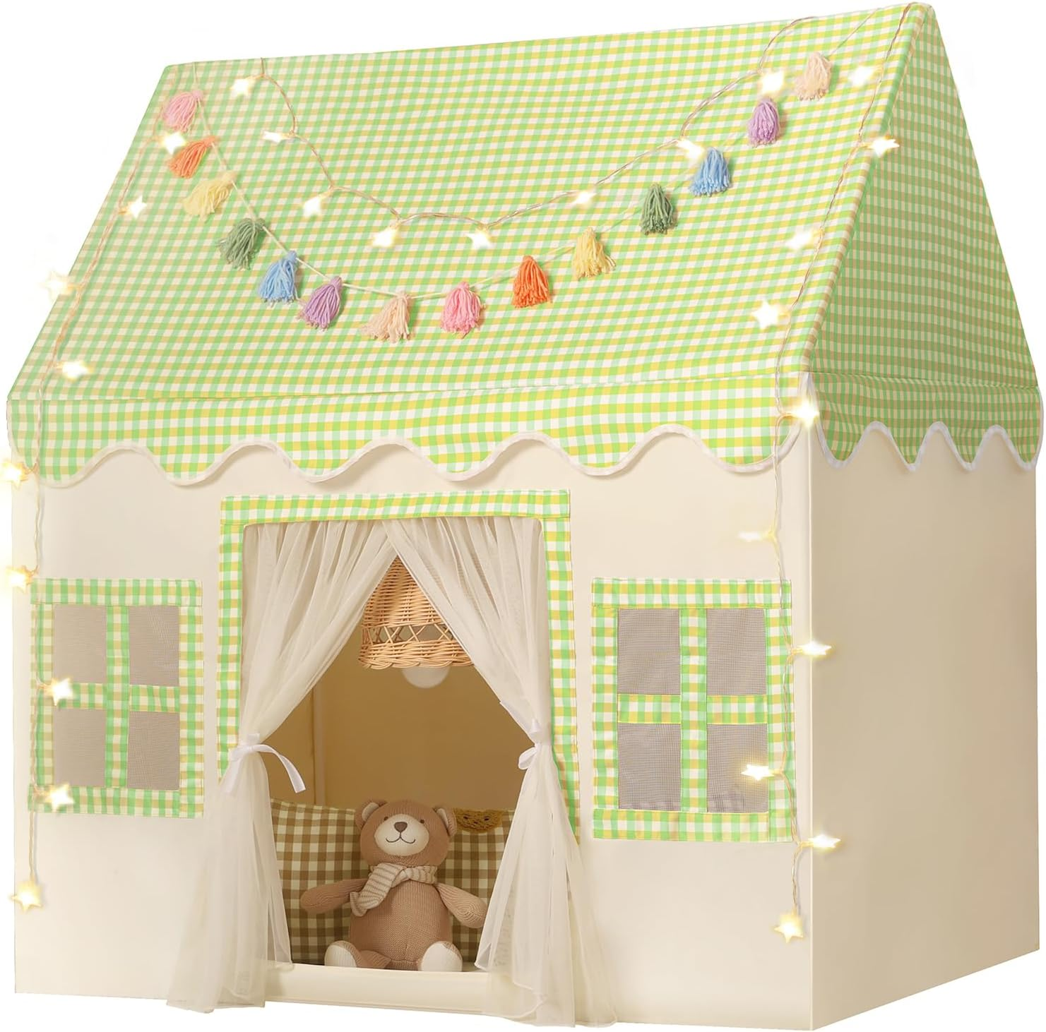 - VERSATILE INDOOR PLAYHOUSE: Ideal for indoor use, this charming tent comes complete with enchanting star lights and a stylish tassel garland, enhancing the ambiance of any playroom. Its cozy design makes it the perfect retreat for kids to enjoy solo or with companions, fostering social interaction and imaginative play in a safe environment.