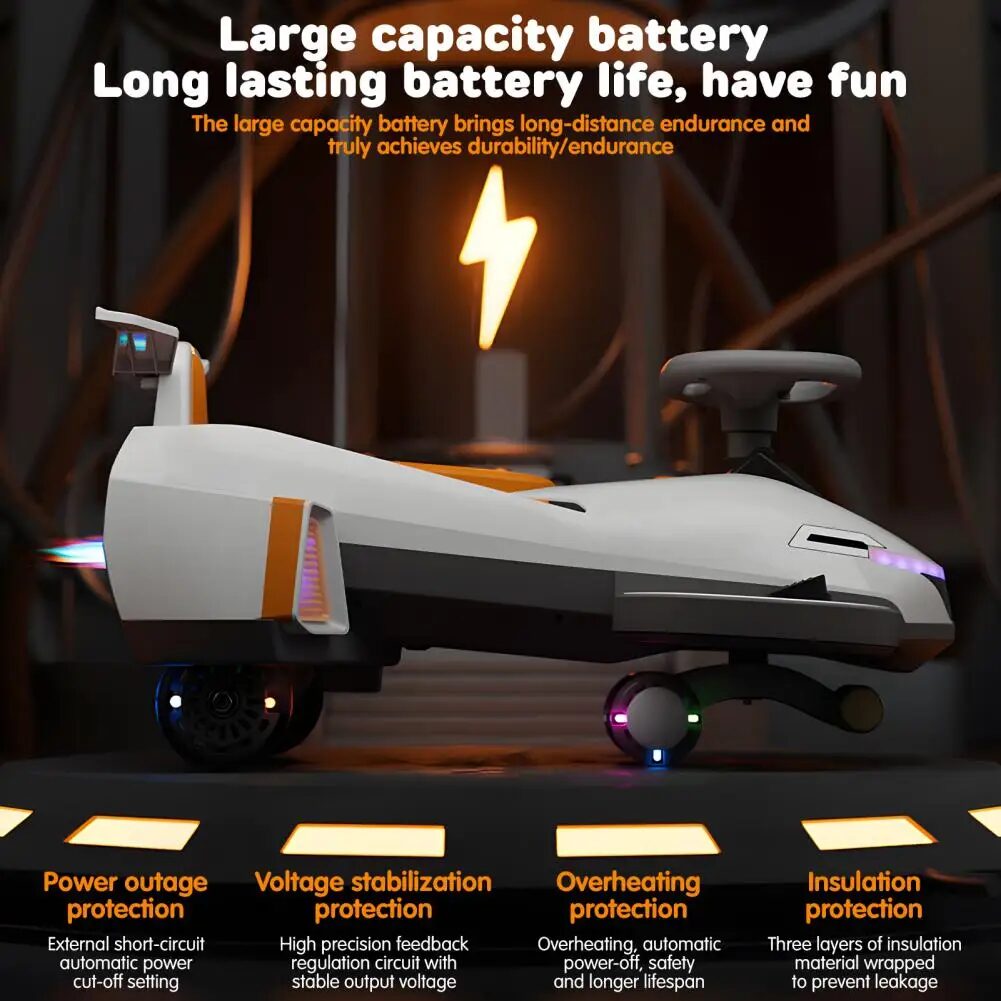 The Electric Twist Car with Music and Helmet is an innovative 2-in-1 swing car designed for children aged 1-6 years. This dynamic vehicle not only provides an exciting ride but also stimulates imaginative play and physical development. The car features a simulated engine function that enhances the driving experience, while the silent shock absorption faux leather wheels ensure a smooth and comfortable journey. With an ergonomic oversized seat and a weight capacity of up to 220 lbs, this twist car is suitable for both children and adults, making it a versatile addition to any playtime adventure.