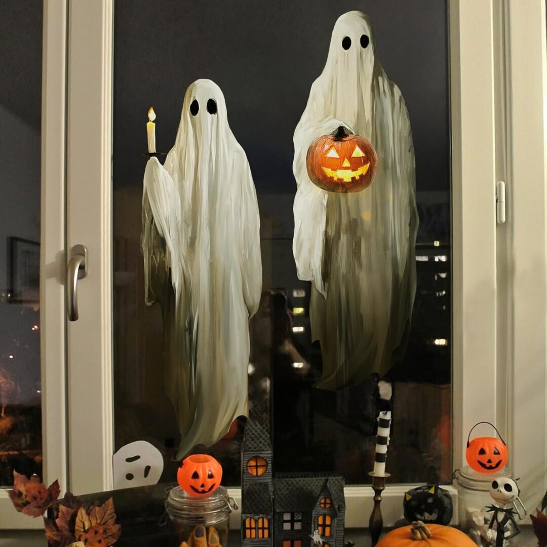 - NEW SEASON DESIGN! This set includes three ghost window decals, each with wacky expressions that bring a sense of fun to your Halloween celebrations. These silhouette stickers are suitable for glass windows, mirrors, metal surfaces, ceramic tiles, and more.