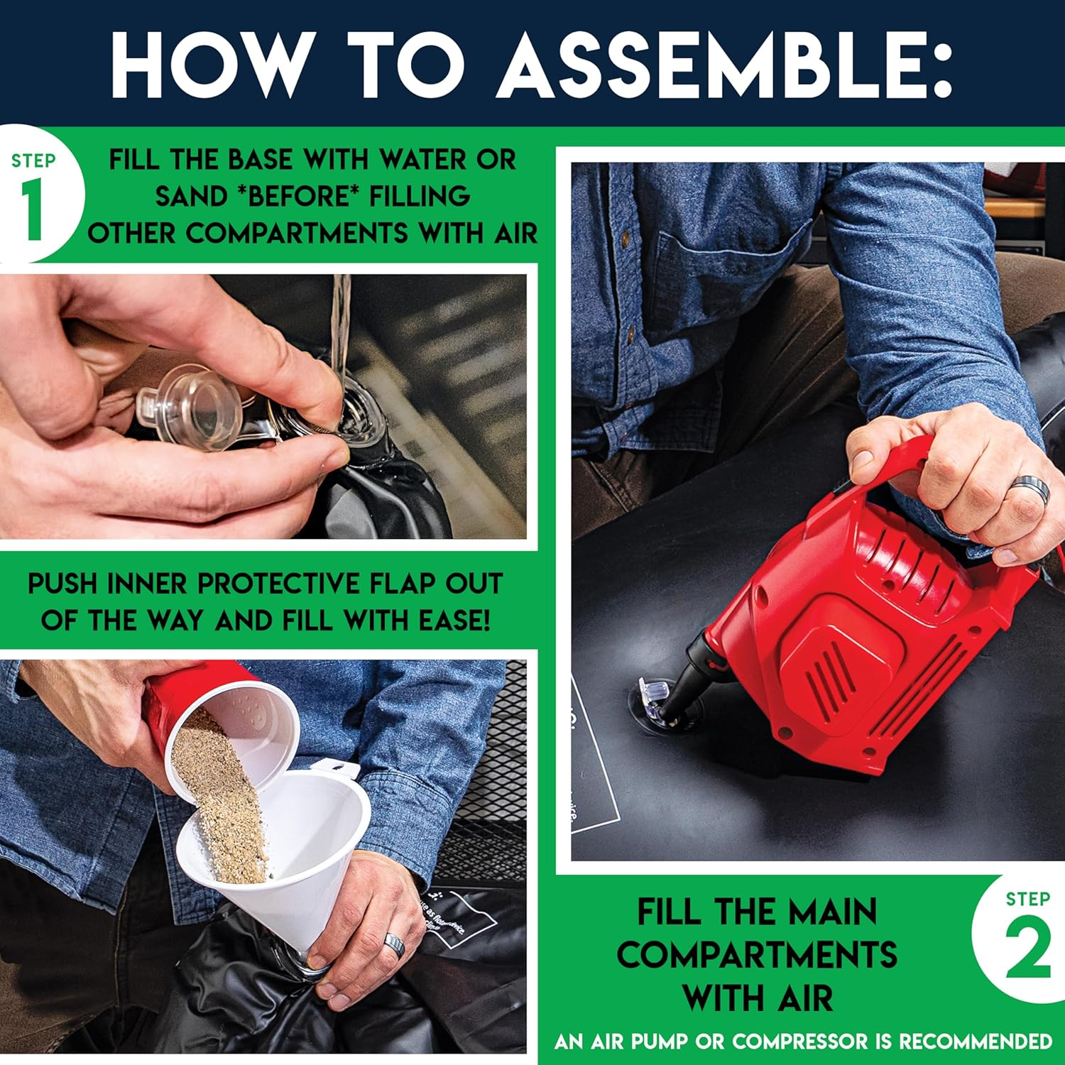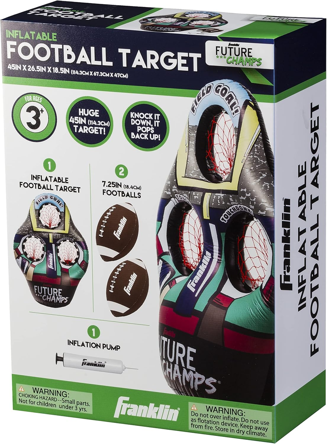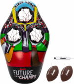 • SET INCLUDES: (1) 45” inflatable 3-hole football target with a water-fillable base, (2) 7.25” rotationally molded PVC footballs, and (1) sports ball hand air pump with needle for easy inflation.