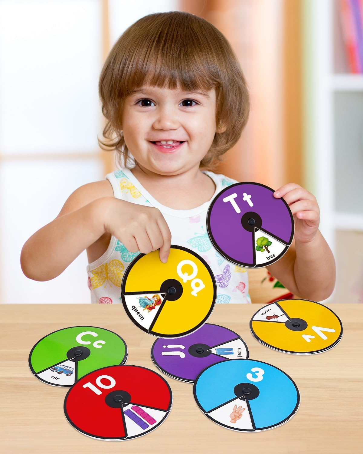 - Colorful Spinning Flashcard Set: This interactive alphabet spinning card set includes 36pcs spinning flash cards, featuring 26 alphabet cards and 10 number cards. Each card contains 6 different words related to animals, foods, everyday objects, and more. It provides a fun and engaging way for toddlers to learn and build their vocabulary.