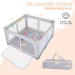 Safety Enclosed: Crafted with your child’s safety in mind, this playpen features anti-collision foam pads at all top joints to cushion any potential impacts, minimizing the risk of injuries. The seamless design eliminates gaps that could lead to pinching, providing peace of mind for parents. Made from robust, child-safe materials, including a sturdy metal frame and BPA-free Oxford fabric, the playpen also includes a 360° see-through mesh cloth that allows parents to maintain visual contact with their little ones, promoting a sense of security. The convenient zip-open side door ensures easy access for both children and caregivers, while the included colorful ocean balls and pull-up rings enhance physical activity and motor skills development.