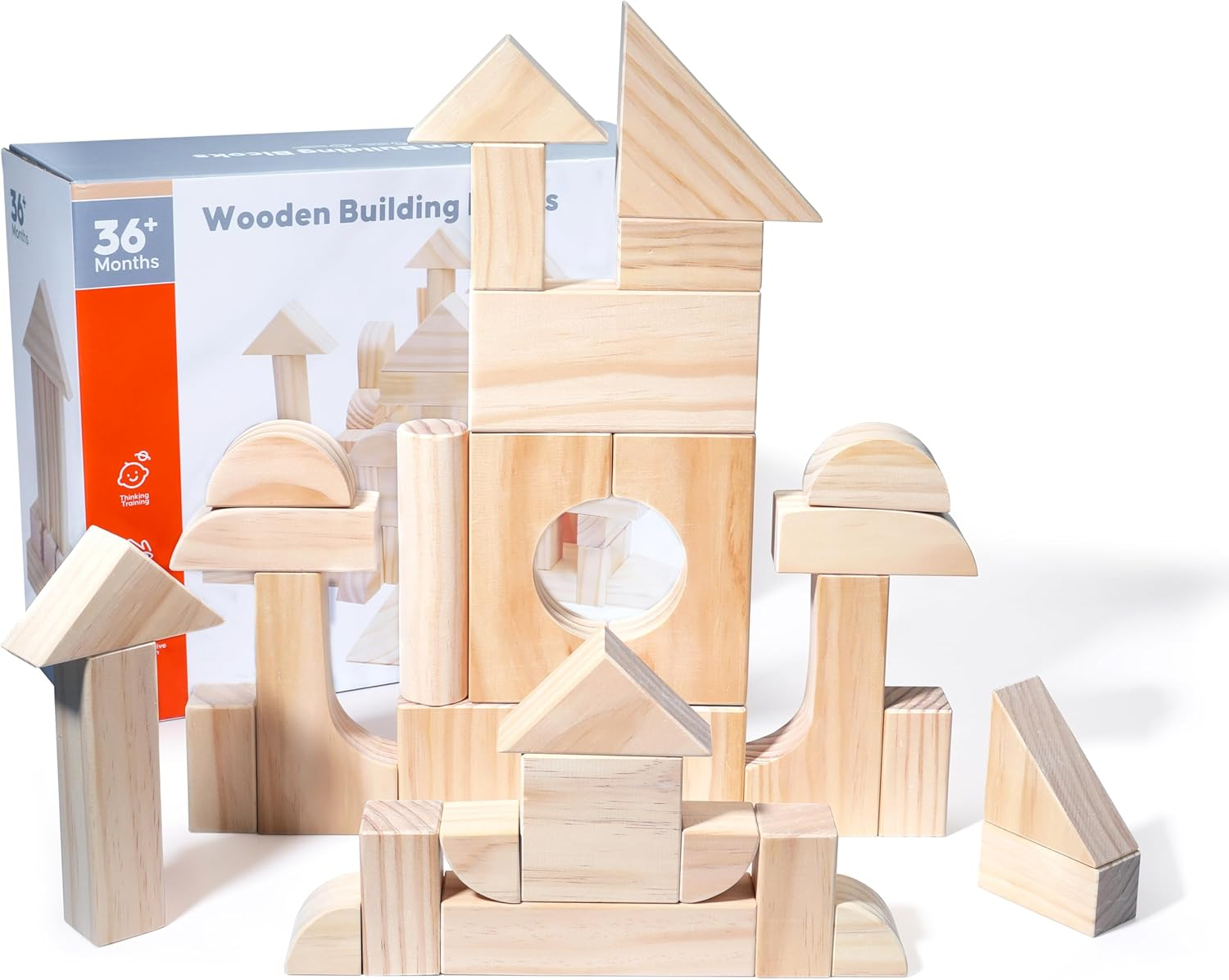 Home Toys Educational Blocks & Stacking Large Wooden Building Blocks Set – Educational Preschool Learning Toys with Wooden Storage Box, Toddler Blocks Building and Stacking Toys for 3+ Year Old Boy and Girl Gifts