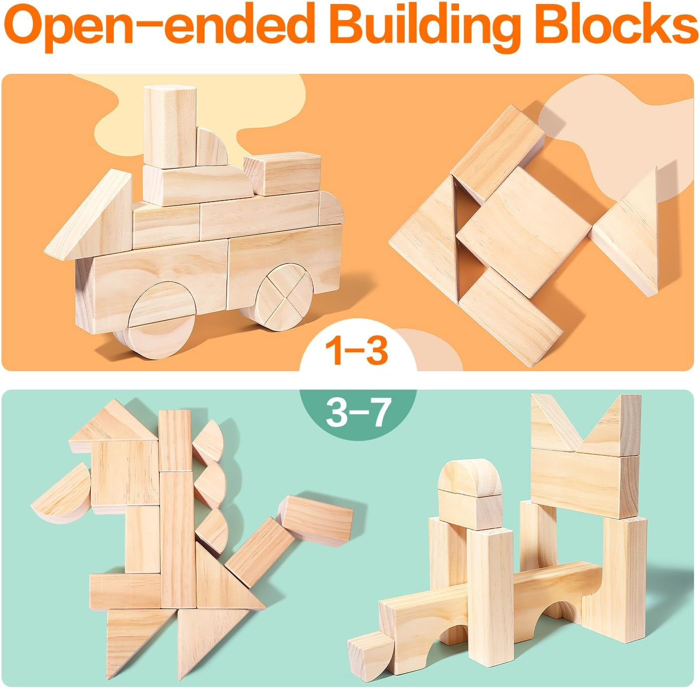 Large Wooden Building Blocks Set – Educational Preschool Learning Toys with Wooden Storage Box, Toddler Blocks Building and Stacking Toys for 3+ Year Old Boy and Girl Gifts