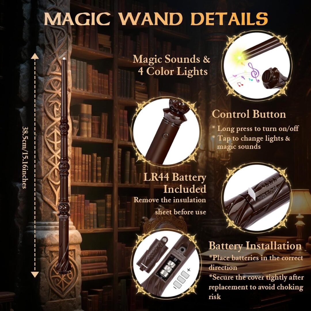• EFFORTLESS PLAY FOR KIDS – Designed for simplicity, this wizard wand features an easy-to-use button that powers the wand on and off; a quick press allows children to switch between light and sound modes, ensuring hours of magical fun.