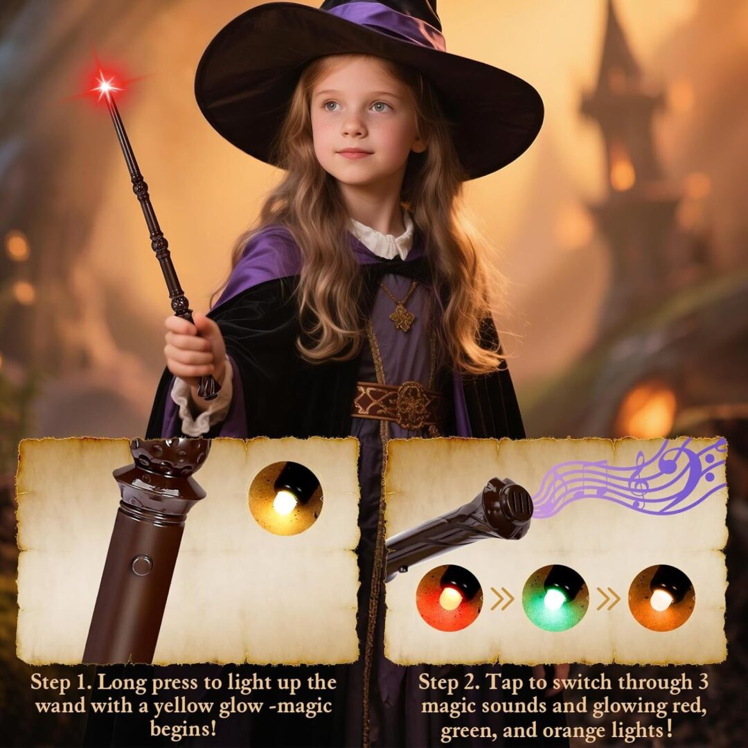 • MAGIC SOUNDS & 4 COLOR LIGHTS – With just a press of the button, this light-up wand illuminates in vibrant yellow, red, green, or orange hues, accompanied by delightful sound effects—transforming every tap into a spellcasting adventure.