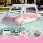 Experience the ultimate summer fun with the Luxury Inflatable Golf Cart Pool Float by FUNBOY and Malibu Barbie. This unique float is designed to transport you to the sun-soaked shores of Malibu, where relaxation and adventure await. Perfect for lounging by the pool or taking a leisurely ride on the water, the oversized design comfortably accommodates two adults, making it ideal for sharing memorable moments with friends. The float features a stylish fringe-lined removable mesh shade that provides protection from the sun, while dual cup holders ensure your favorite beverages are always within reach.