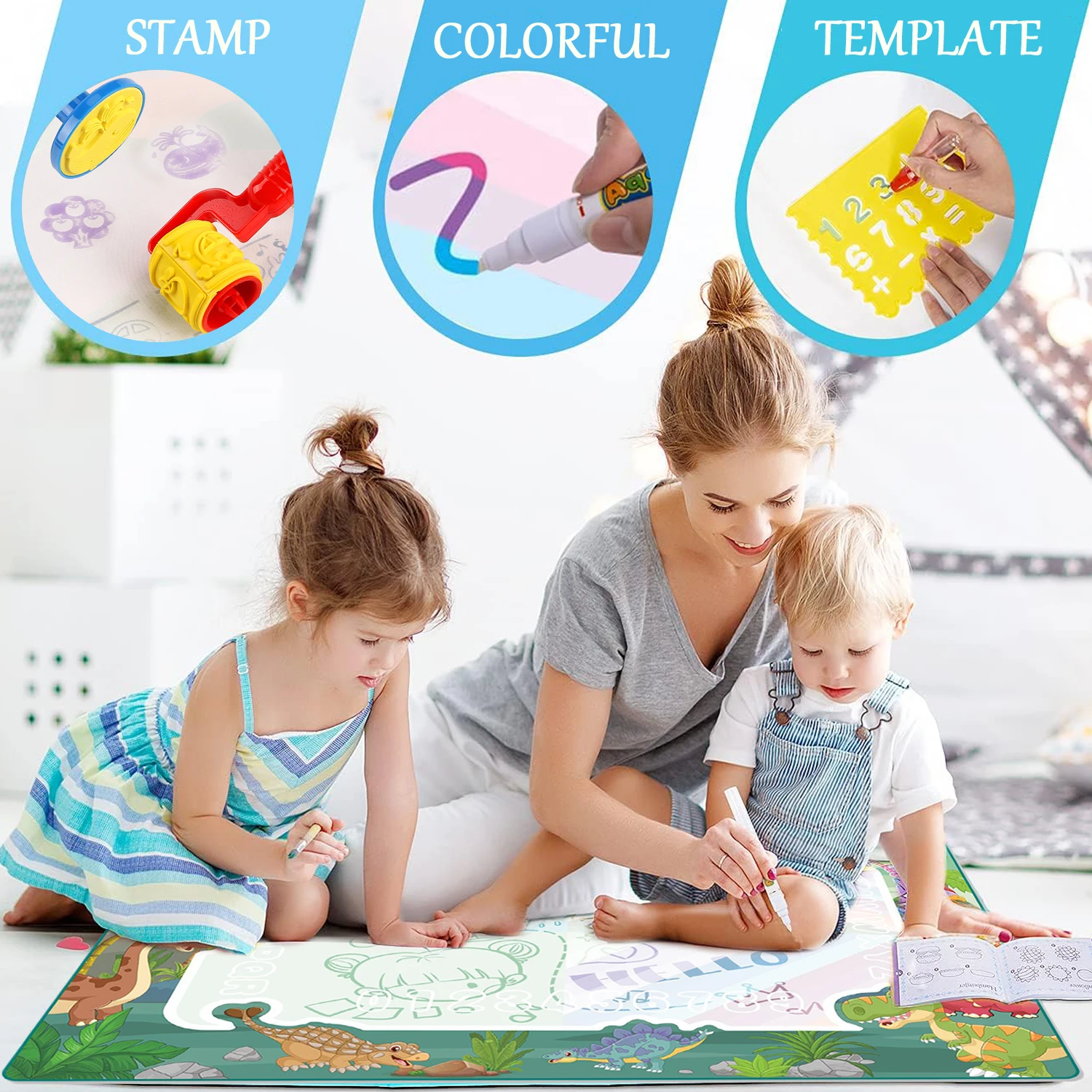 🔵 Educational Toy【Safe, Clean】——Crafted from non-toxic materials, this doodle mat is completely safe for children. It eliminates the need for paints or messy cleanup, as the waterproof nylon backing protects your floors from spills. Perfect for indoor play, outdoor adventures, or travel, this mat is designed to be portable and easy to use, making it an ideal educational tool that nurtures creativity and fine motor skills in a clean and safe environment.