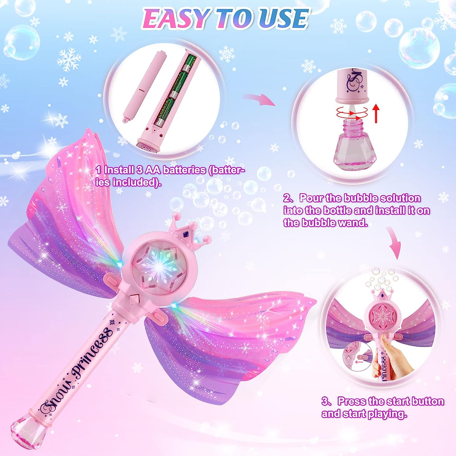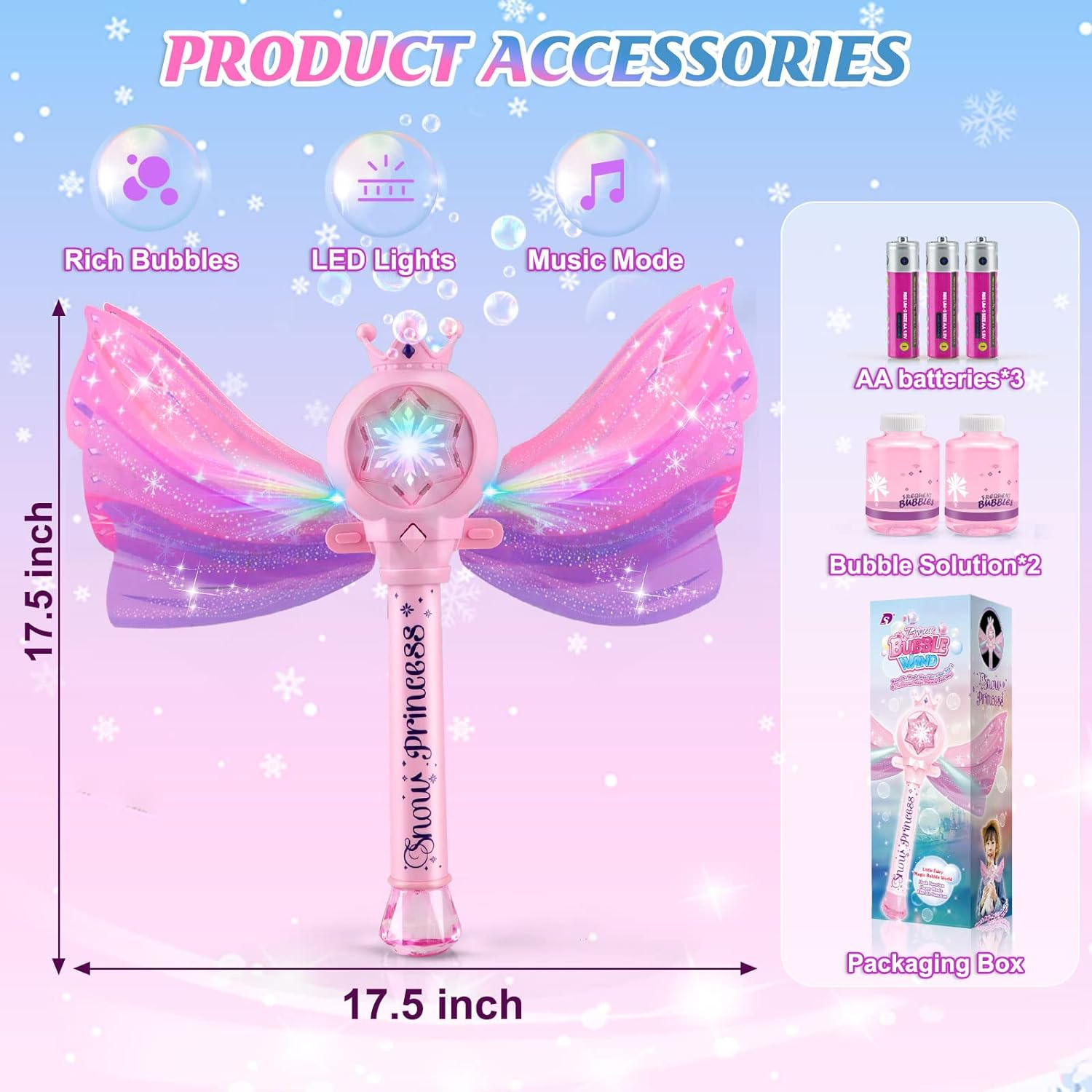 - PERFECT GIFT: The Bubble Wands make a fantastic gift for any occasion. Whether it’s for a birthday, holiday, or just a special treat, the Bubble Wands will delight any child with their magical fairy tale design and captivating bubbles, lights, and music. So, give the gift of imagination and wonder with the Bubble Wands