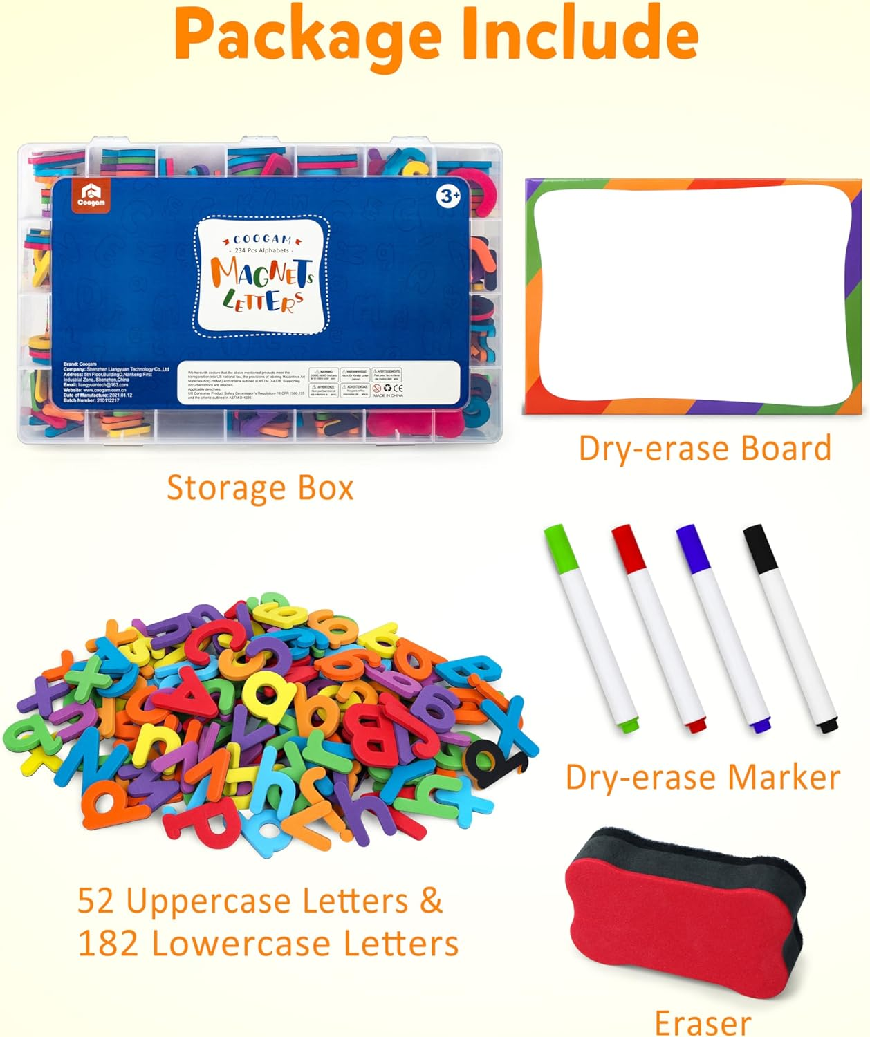 - Plenty of Magnetic Letter: Our Classroom Educational Alphabet Magnets Kit contains a total of 234 magnetic letters of 9 different brightly colors. Includes 2 x 26 uppercase magnetic letters , 7 x 26 lowercase magnetic letters, 2 x question marks, 2 x exclamation points, 1 x eraser, 4 x marker, and 1 magnetic board.