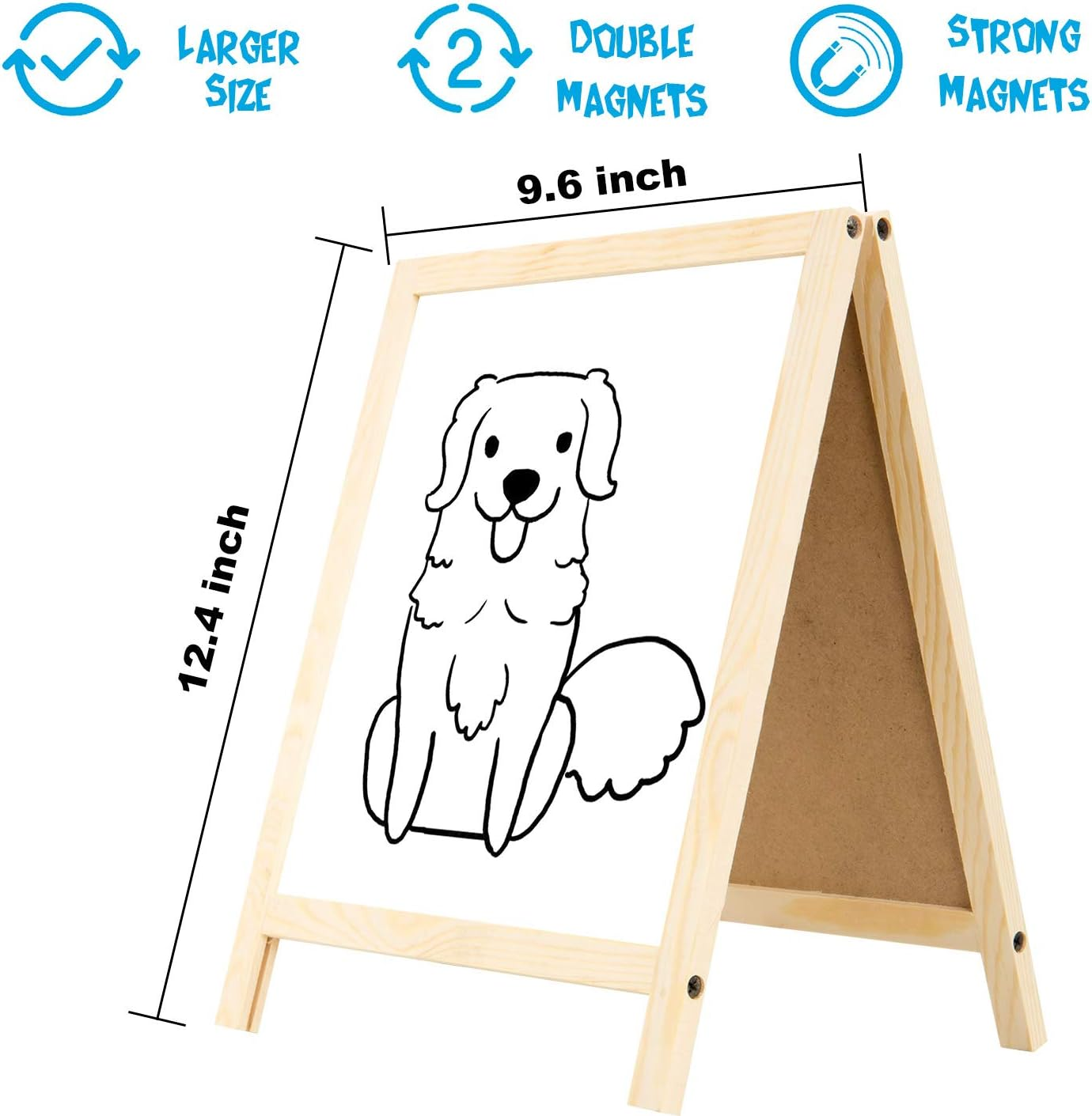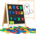 • DRY ERASE EASEL MAGNET BOARD FOR KIDS – the large surface board can fit multiple words, sentences, and math problems. Magnetic dry-erase board on one side, magnetic chalkboard on the other. Let your child watch their vocabulary displayed proudly with this magnetic alphabet letters and numbers.