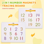 - Double-Sided Design: The front displays numbers 1-11, while the back shows numbers 12-20. Each number is clearly marked with stroke order and direction, helping children learn to write numbers correctly and develop both number recognition and fine motor skills.