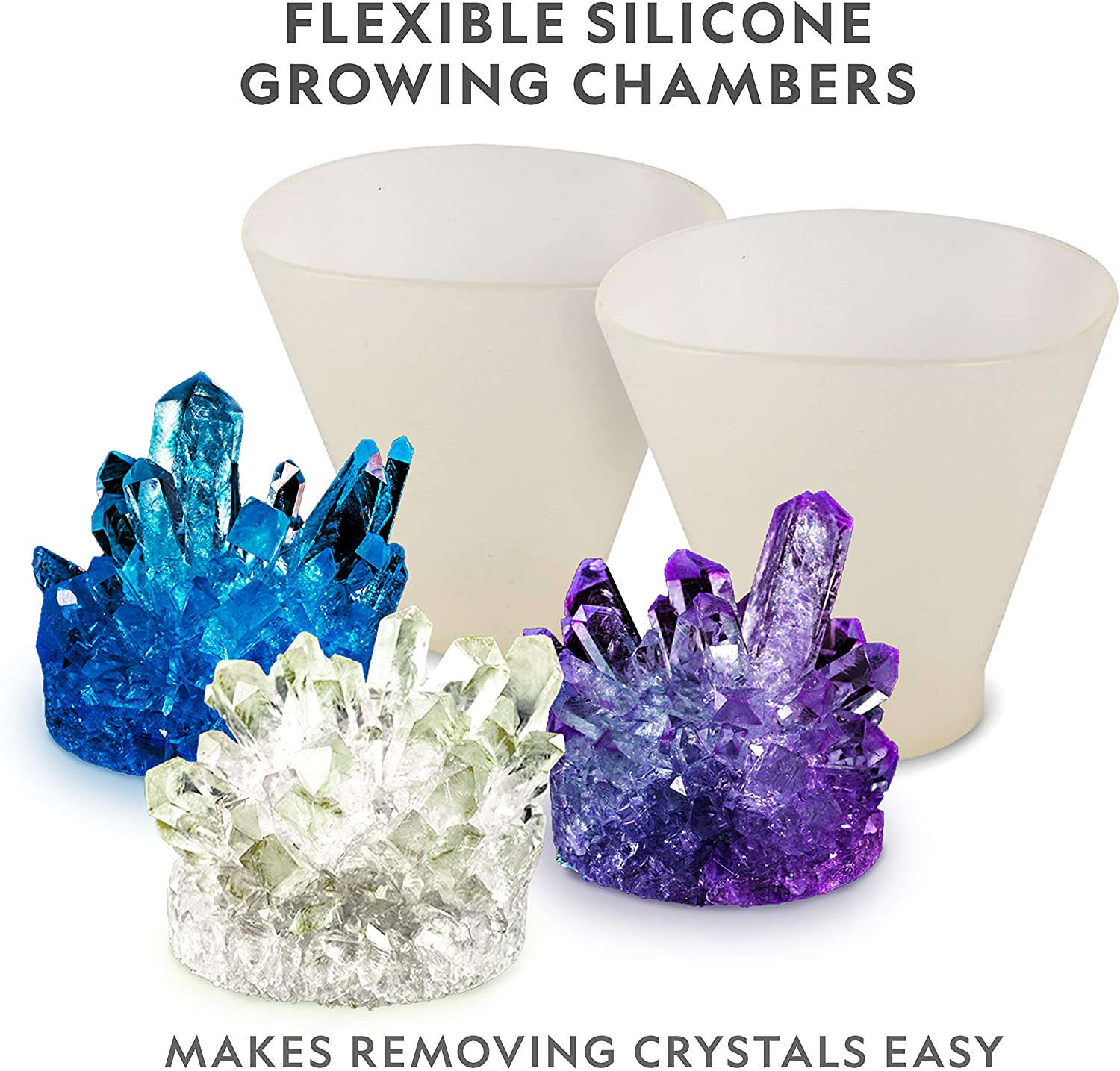 - GROWING IS EASY – Easy-to-follow instructions and 2 silicone growing chambers make growing your crystals. Our new clear crystal seed rocks can be left in your delicate crystals and grown crystals can be placed directly into your display