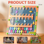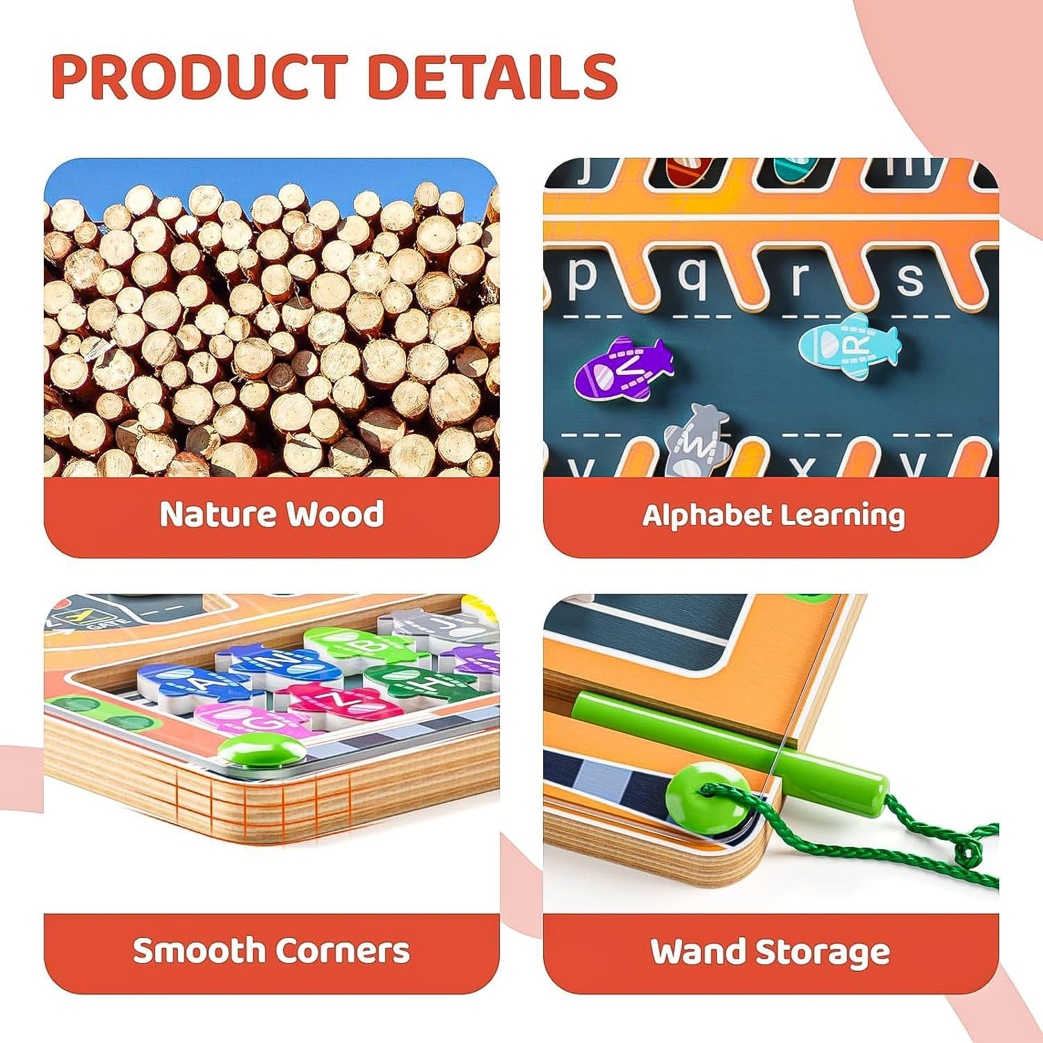 The Montessori Magnetic Alphabet Letter Maze is also portable and compact, making it a great on-the-go toy for long car rides, trips, or even for use at home. Its compact size ensures easy storage when not in use. This toy is perfect for toddlers and kids, serving as an ideal toy for Christmas, Halloween, New Year, birthdays, holidays, travel, and other special occasions. The magnetic maze toy is made of high-quality wood that is non-toxic, ensuring endless fun and entertainment for children. It has smooth corners designed to prioritize the safety and comfort of children’s hands. The magnetic design of the toy allows for easy movement of each puzzle piece, ensuring that the puzzle stays in place for a hassle-free and enjoyable play experience. The Montessori maze toy also features a magnetic wand storage feature for easy organization, providing a practical and convenient way to keep the wand organized.