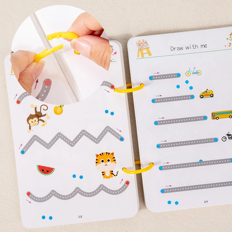 The Montessori Pen Control Training Workbook for Children is a comprehensive exercise book designed for kindergarten and pre-school children. This workbook offers a variety of exercises that support the development of fine motor skills, concentration, and hand-eye coordination. It includes coloring pictures and cognitive games to engage children while they practice essential skills.