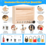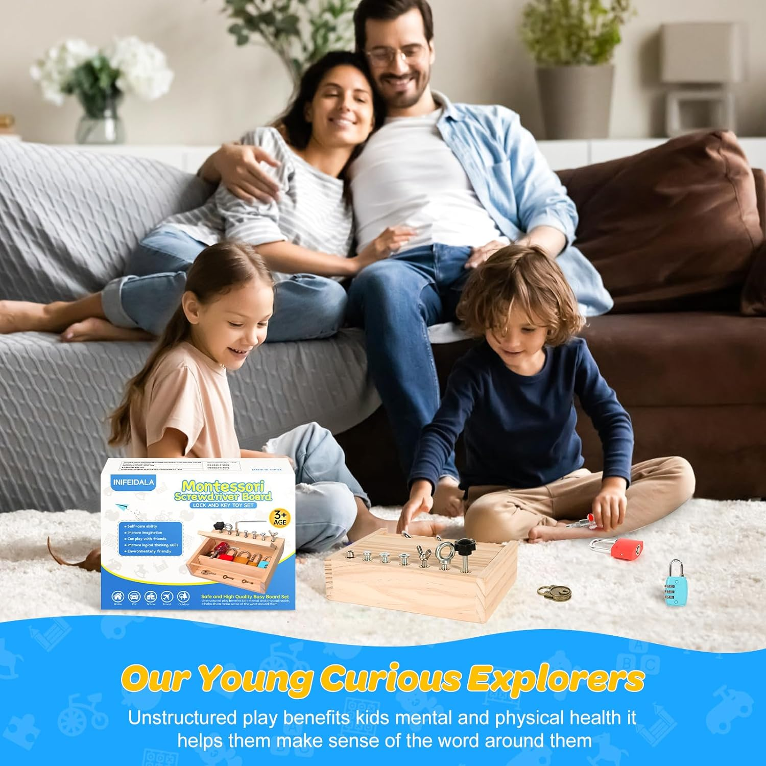 • Montessori Busy Board: Our INIFEIDALA Montessori Screwdriver Board Lock and Key Set is designed to turn a boring learning process into a creative and fun one. This toy for toddlers ages 3+ will help toddlers gain fun and confidence as they learn the real-life skills of using a screwdriver, using a variety of locks, and holding keys correctly while playing. It also helps push young children to explore and problem-solve. Also trains hand-eye coordination and develops their fine motor skills