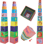 Each of Cube Blocks in a different size, babies stack the blocks from biggest one to smallest one and build a tower, it can be reach 3 ft tall. Most babies love push all blocks down after they finished a tower, it so funny and make babies laugh louder.