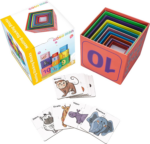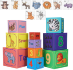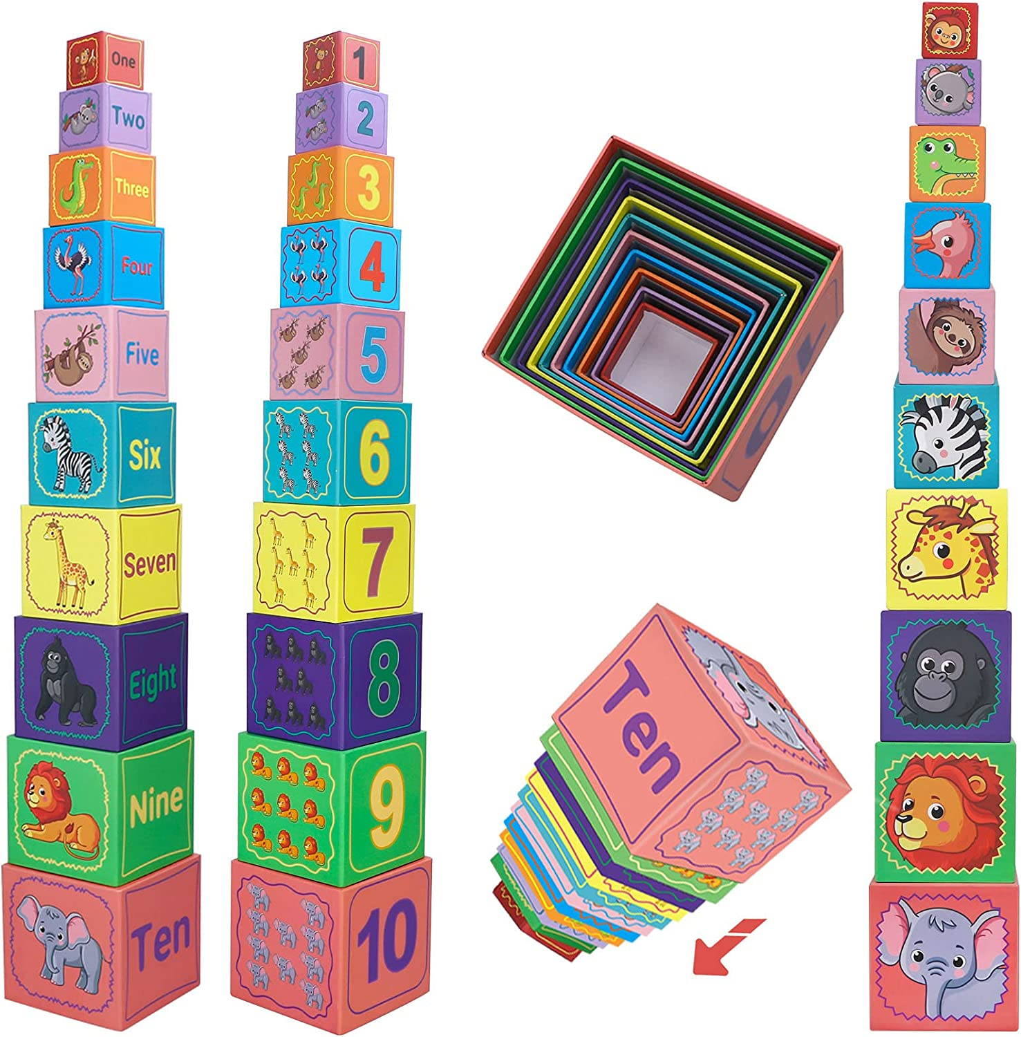 • Nesting and Stacking Blocks Stacker composed of 10 cardboard Cube boxes, showing numbers 1-10 and different animals. And the animals puzzle includes 9 animals, 36 pieces, 4 pieces per 1 animal.