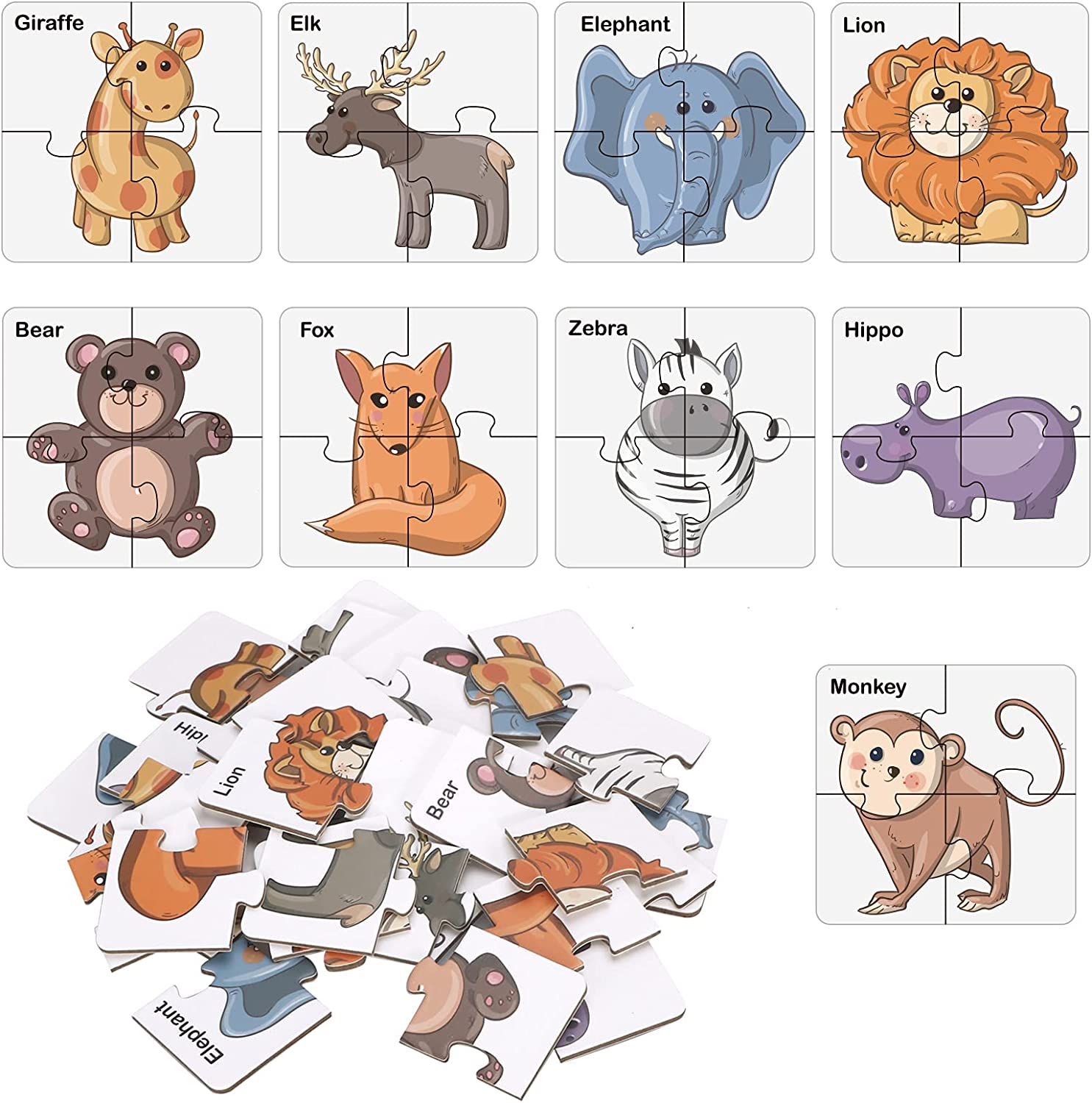 • There are 36 pieces in total in this puzzle set,per one animal card need 4 pieces,you will get 9 animals: Monkey,Fox,Elephant,Lion,Hippo,Bear,Elk, Giraffe, Zebra.
