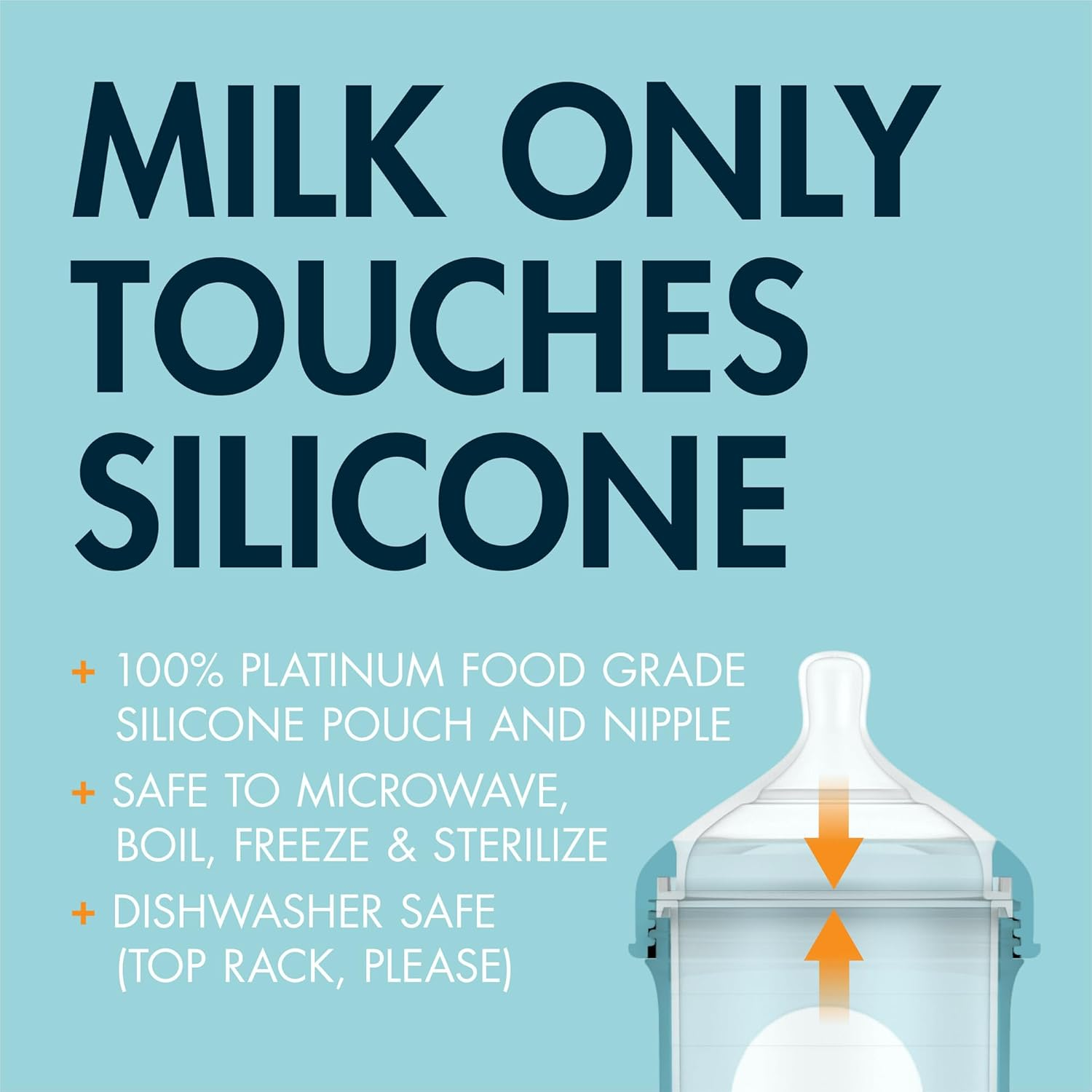 • Safety of Silicone: Your baby’s milk comes into contact solely with the 100% food-safe silicone of the nipple and pouch, ensuring peace of mind as these bottles are made without BPA or PVC.