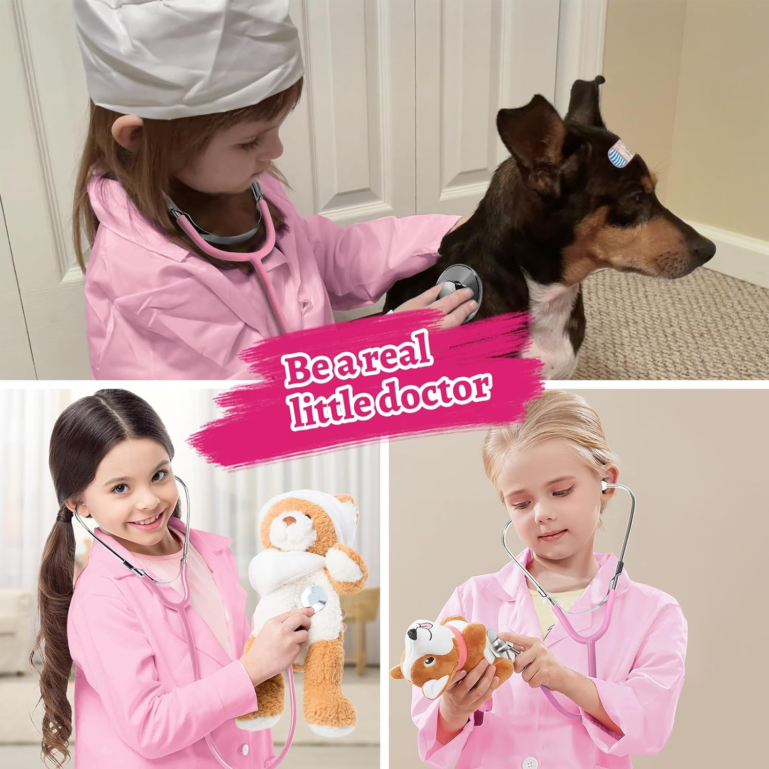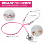 To give girls and boys a more realistic play experience, the stethoscope included in the kit is real. Kids can hear the heartbeats when they use it.