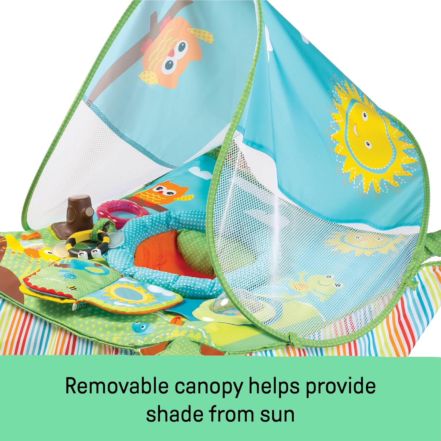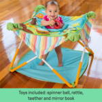 • 3 adjustable heights to grow with baby; little ones will love the sensory toys including a spinner ball, rattle, teether, and mirror book