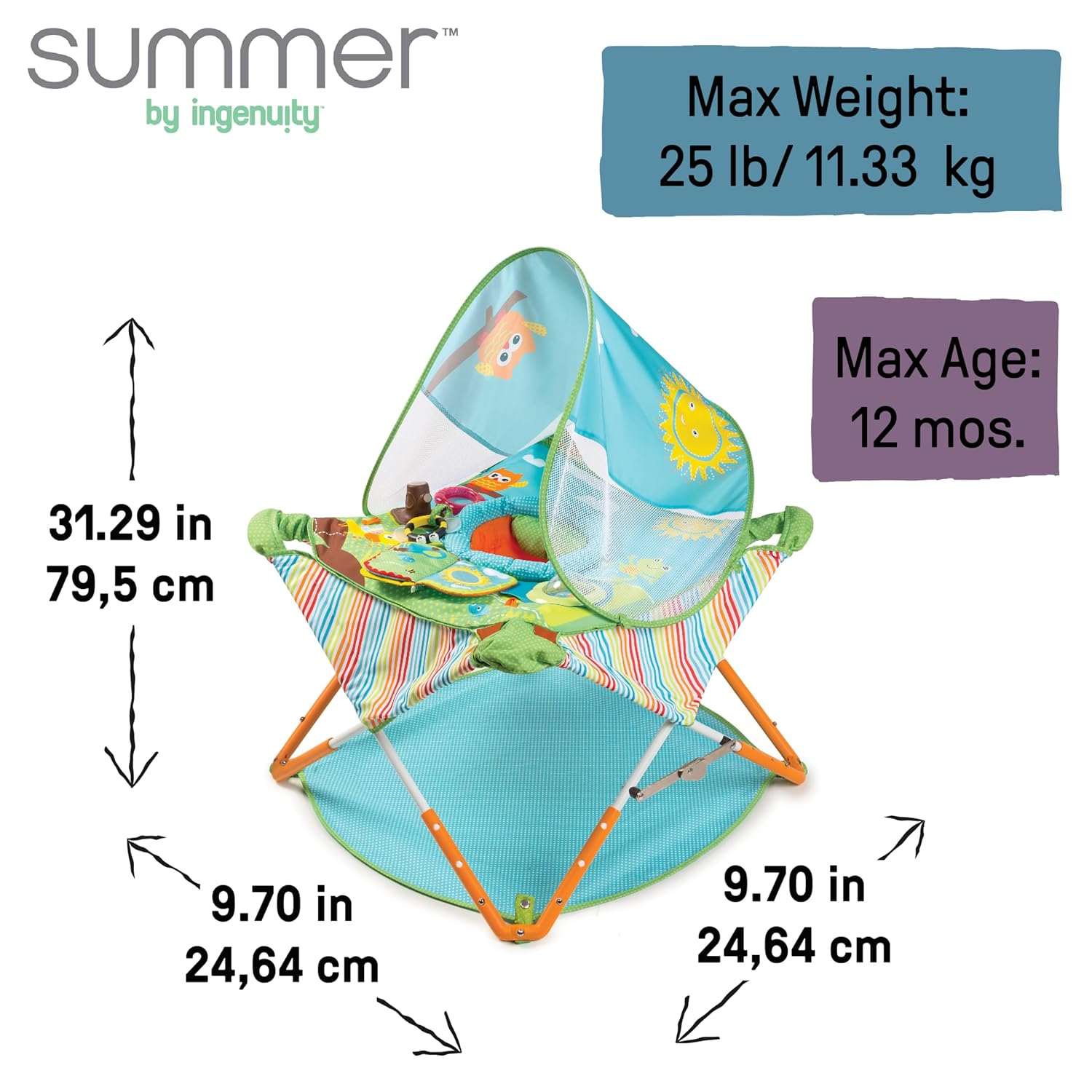 Give baby an engaging play space indoors or outside with the Summer by Ingenuity Pop N Jump with Canopy Activity Center. Featuring a compact, foldable design, this lightweight yet durable jumper features an innovative pop and fold design that sets up and stores in seconds. Perfect for babies ages 6 to 12 months, up to 25 pounds, your little one will love to bounce and play in this portable jumper. The canopy provides shade and is easy to install or remove. Multisensory toys keep baby engaged as they play: spinner ball, rattle, teether, and mirror book. 3 height adjustments to grow with baby. Stores easily in the included storage bag, which features a shoulder strap so you can easily take the Pop N Jump anywhere! Jumper support seat is machine washable. Dimensions: 30.25 x 9.75 x 9.75 inches.