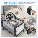 The Portable 4-in-1 Baby Nursery Center Travel Crib is a versatile solution designed to cater to the various needs of your growing baby. This multifunctional nursery center serves as an infant bed complete with a canopy and net, a cozy baby bassinet, a convenient changing table, and an interactive baby playard. The removable changing table alleviates the strain on your back and waist during diaper changes, making it a practical addition to any nursery or travel setup. With its thoughtful design, this nursery center ensures that you have everything you need at your fingertips, whether at home or on the go.