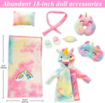 “Rainbow Unicorn Doll Costume Set with Matching Sleeping Bag – Perfect for 18 Inch Dolls!”