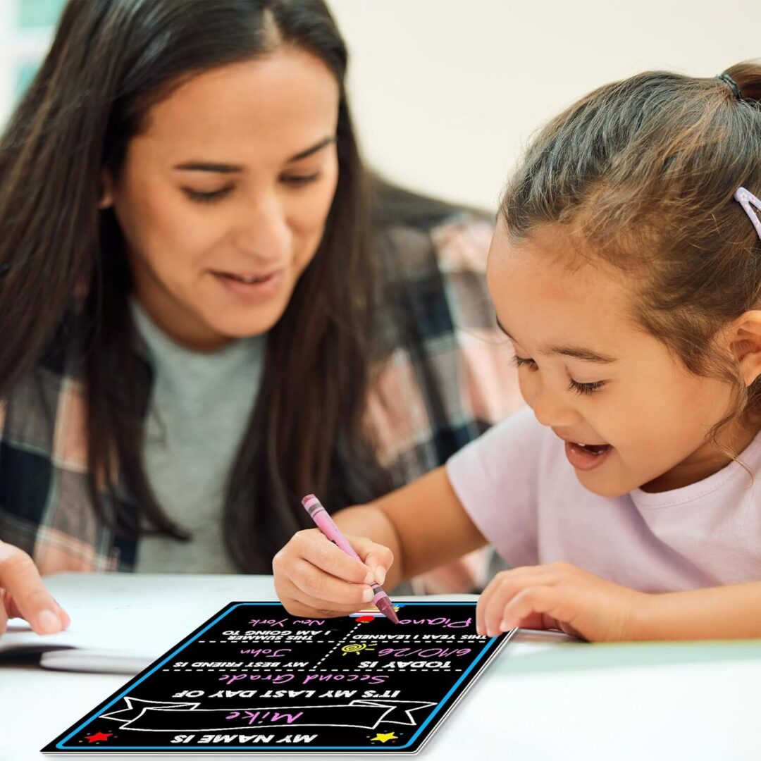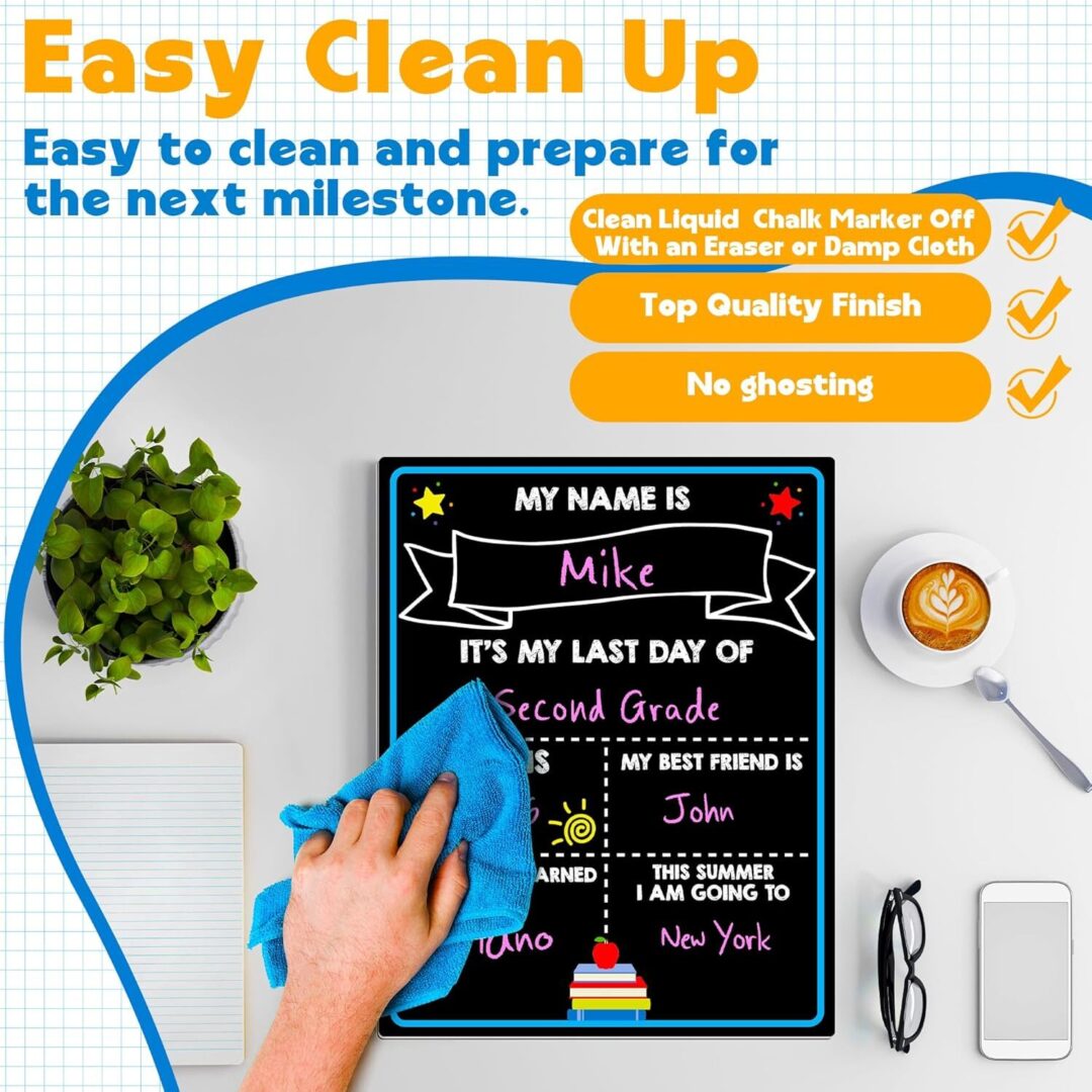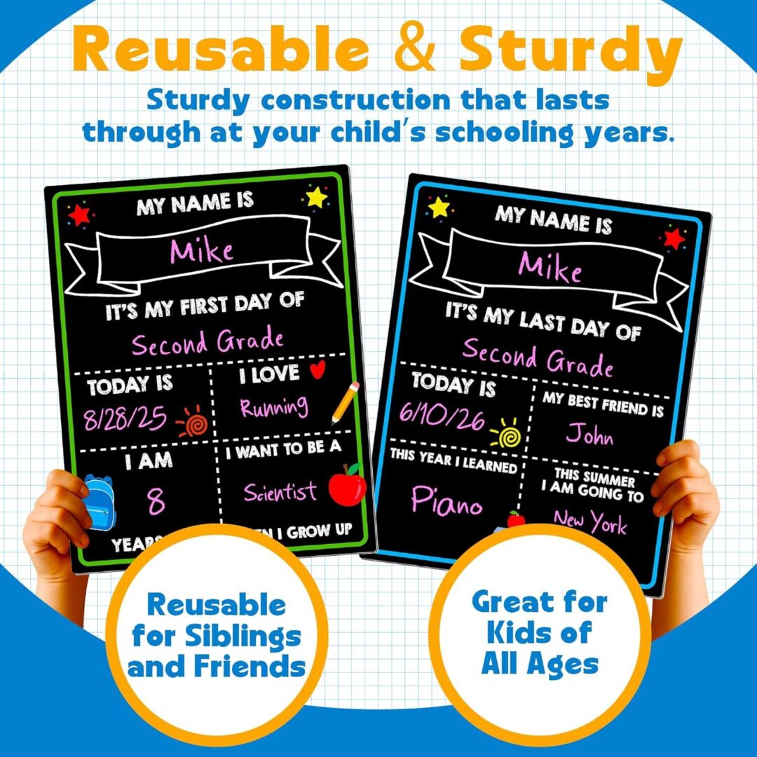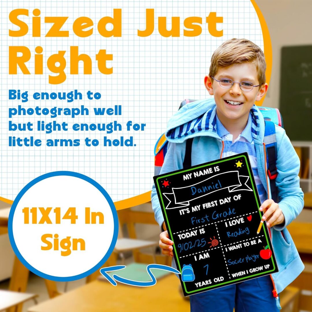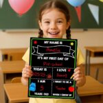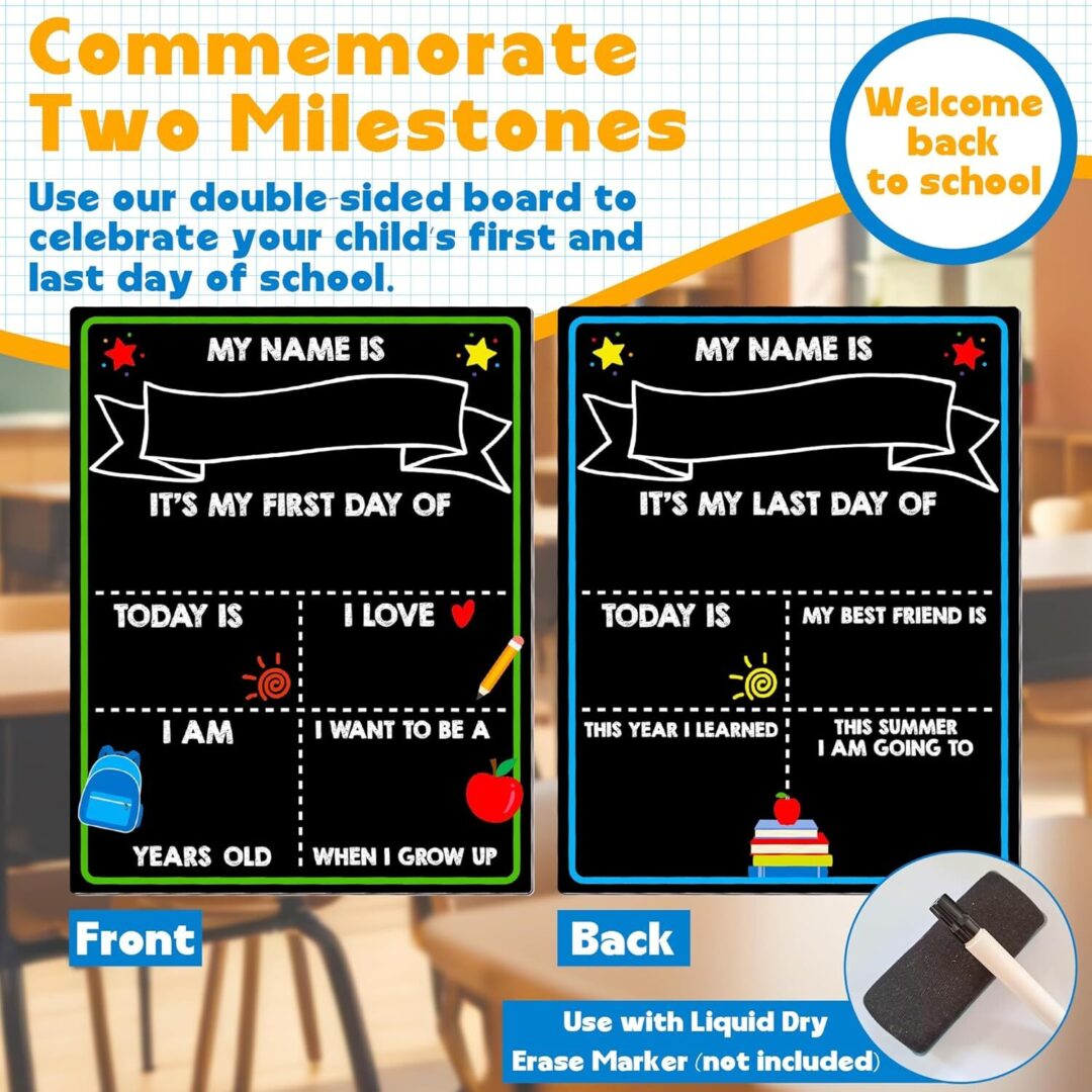 - Elegant Dual-Sided Design: The Melisheer Reusable First Day of School Chalkboard Sign features a stunning dual-sided design. One side captures the excitement of the first day, while the reverse beautifully showcases year-end achievements, allowing you to document your child’s growth throughout the school year.