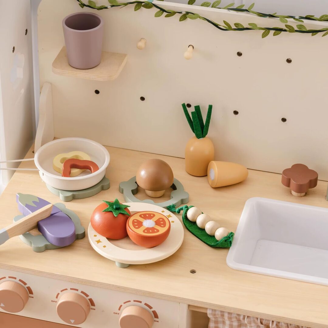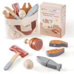The ROBUD Wooden Pretend Play Food Set is designed to inspire creativity and imaginative play in children. This beautifully crafted set includes a vibrant array of sliceable fruits, vegetables, bread, fish, and more, allowing young chefs to engage in realistic kitchen role-play. From bananas to salmon, and even a whole loaf of bread, each piece is meticulously designed to enhance the authenticity of their culinary adventures. This set pairs perfectly with toy kitchens, providing endless opportunities for creative storytelling and role-playing, making it an essential addition to any playroom.