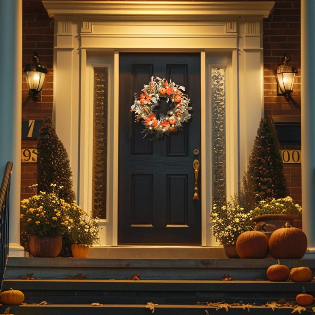 Stunning 24” Collapsible Fall Wreath with Lights – Silk Lambs Ear & Pumpkins for Autumn Door Decor, Perfect for Halloween & Thanksgiving!