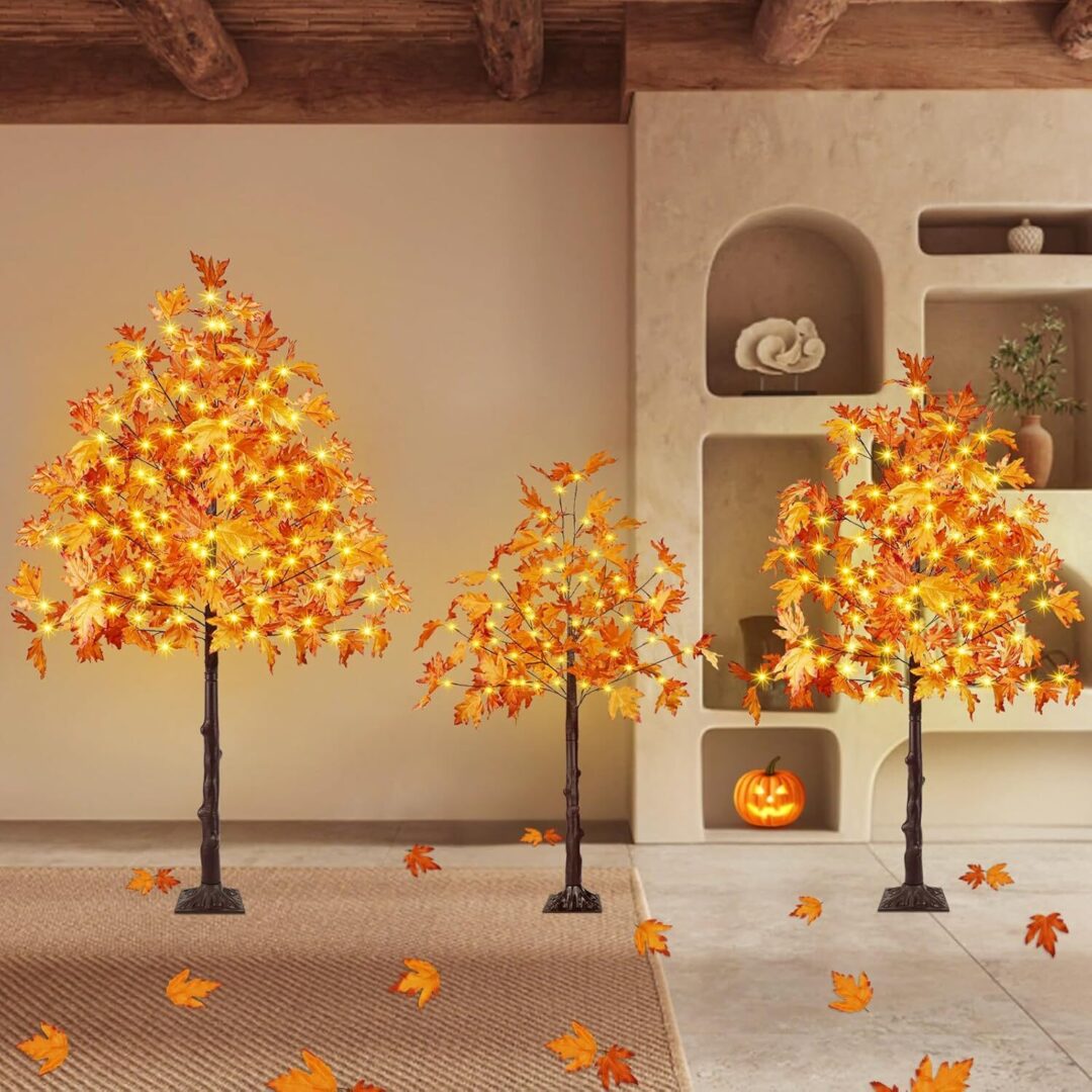 Stunning Set of 3 Pre-Lit Artificial Maple Trees – 4FT, 5FT, and 6FT with 300 LED Warm White Lights for Captivating Fall Decor – Perfect for Thanksgiving, Halloween, and Outdoor Gatherings!
