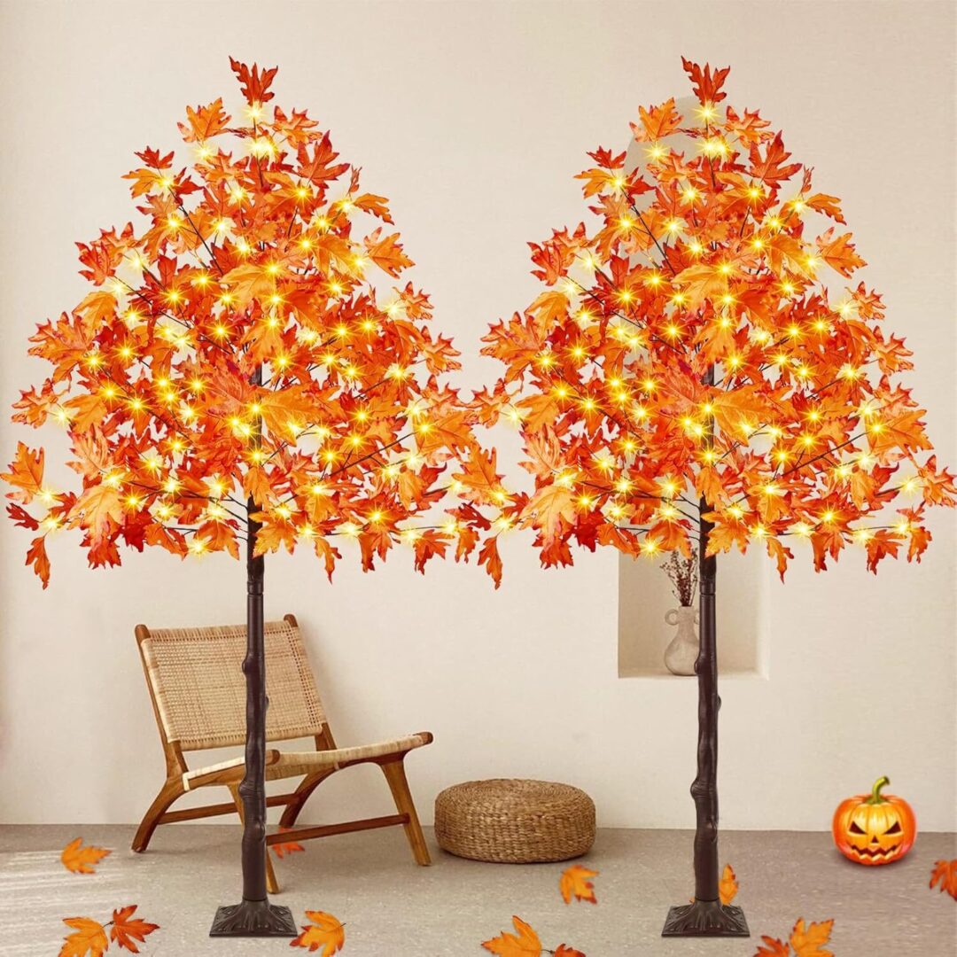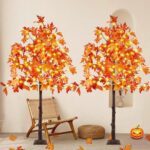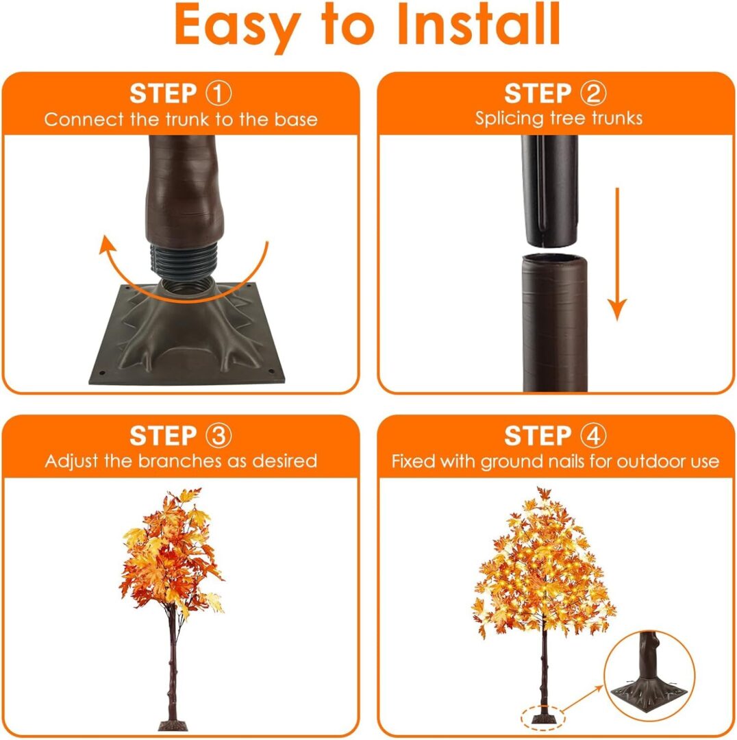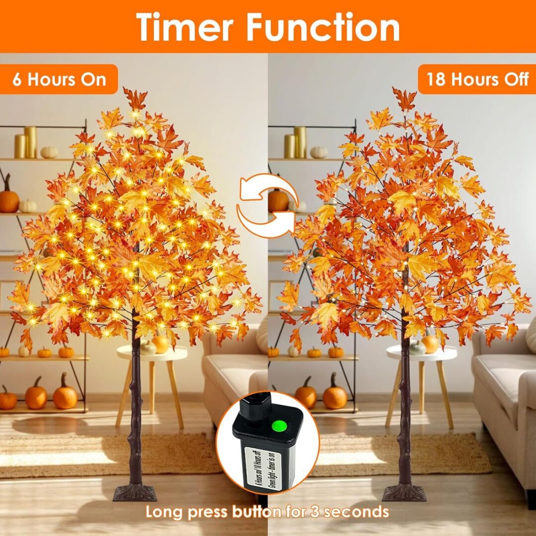 • The versatility of these trees is further enhanced by their built-in timer function, which allows for effortless operation. Simply plug the tree into an outlet, and with a long press of the adapter button, activate the timer to keep the lights on for 6 hours and off for 18 hours each day. Additionally, the adjustable branches enable you to customize the look of your trees, allowing for the addition of lightweight ornaments or extra maple leaves included in the package for a more natural appearance.