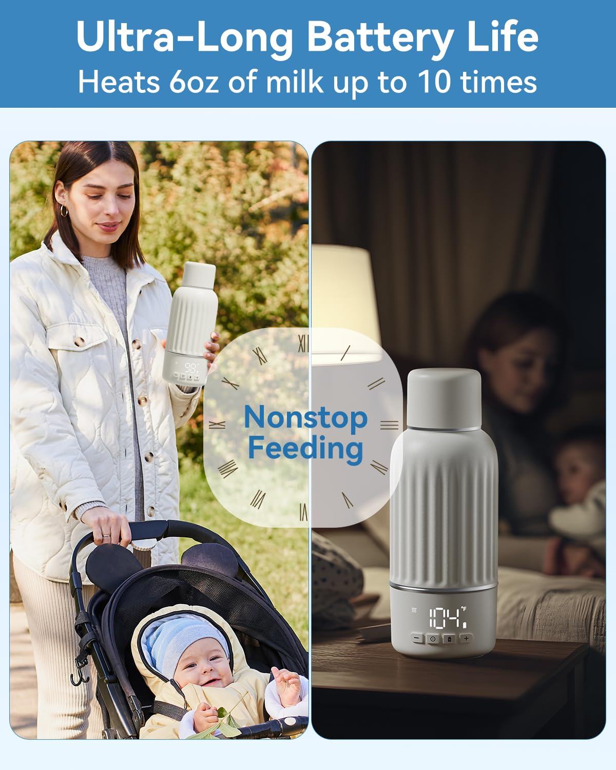 • Fast Charging & Long Battery Life: With 36W fast charging and a 10400mAh battery, this milk warmer fully charges in just 2 hours. One charge can heat 6oz of breast milk up to 10 times, making it perfect for all-day use with this portable milk warmer.